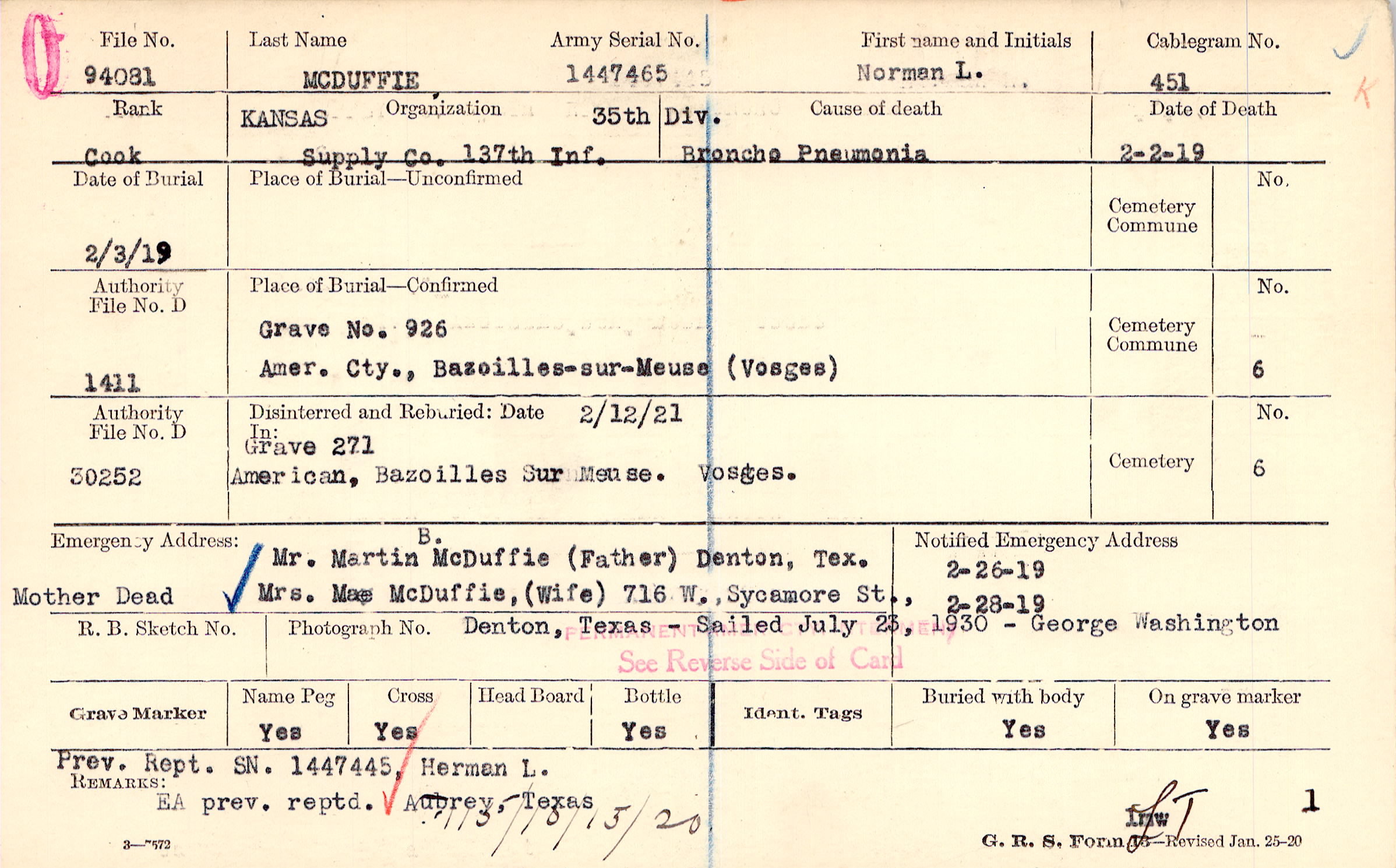 Mr. Martin B. McDuffie (Father) Mrs. Mae McDuffie, (Wife), Denton, Tex., Mother Dead Mrs. Mae McDuffie, (Wife) 716 W. Sycamore St., Denton, Texas - Sailed July 23, 1930 - George Washington