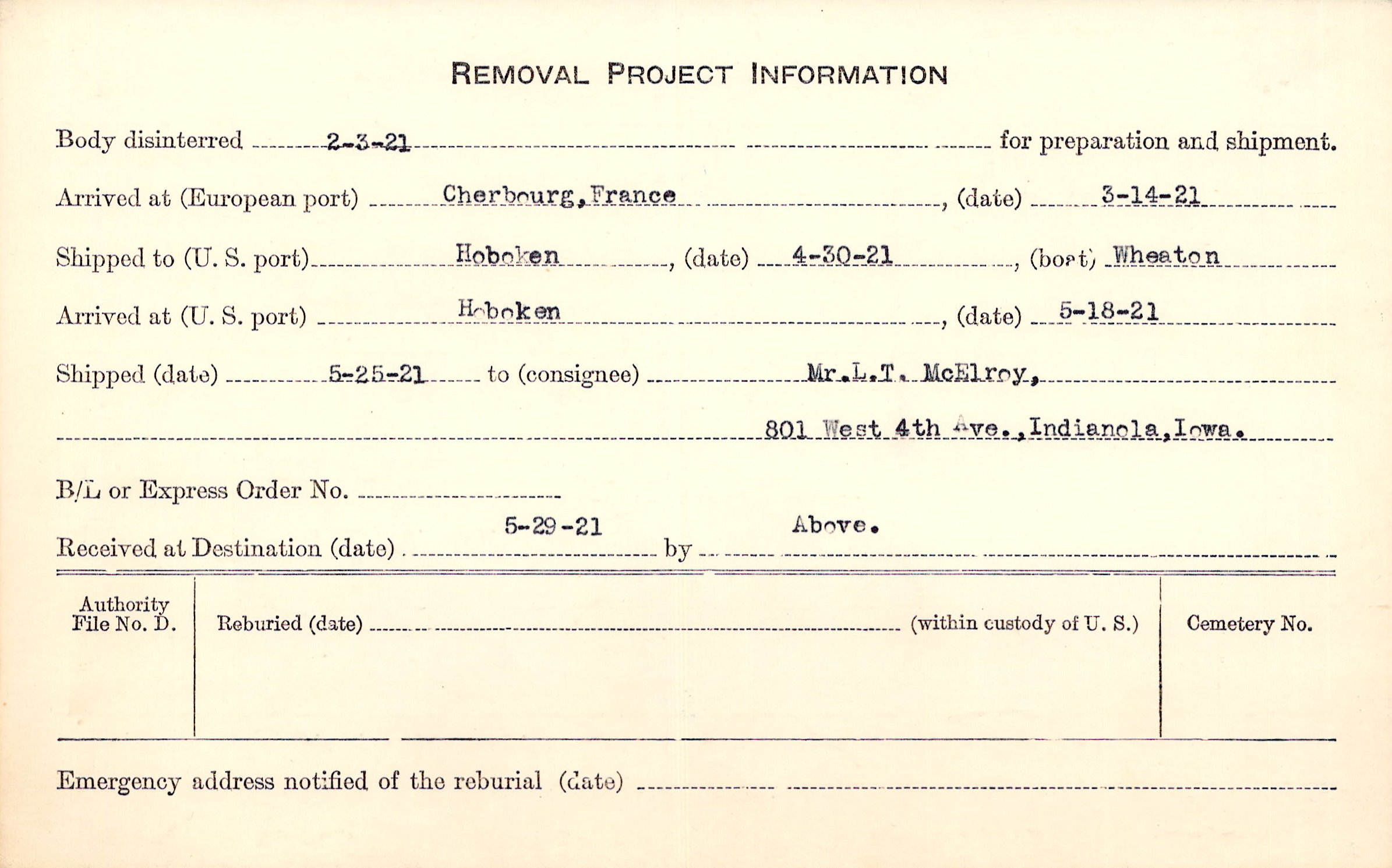Body disinterred 2/3/1921 for preparation and shipment.
