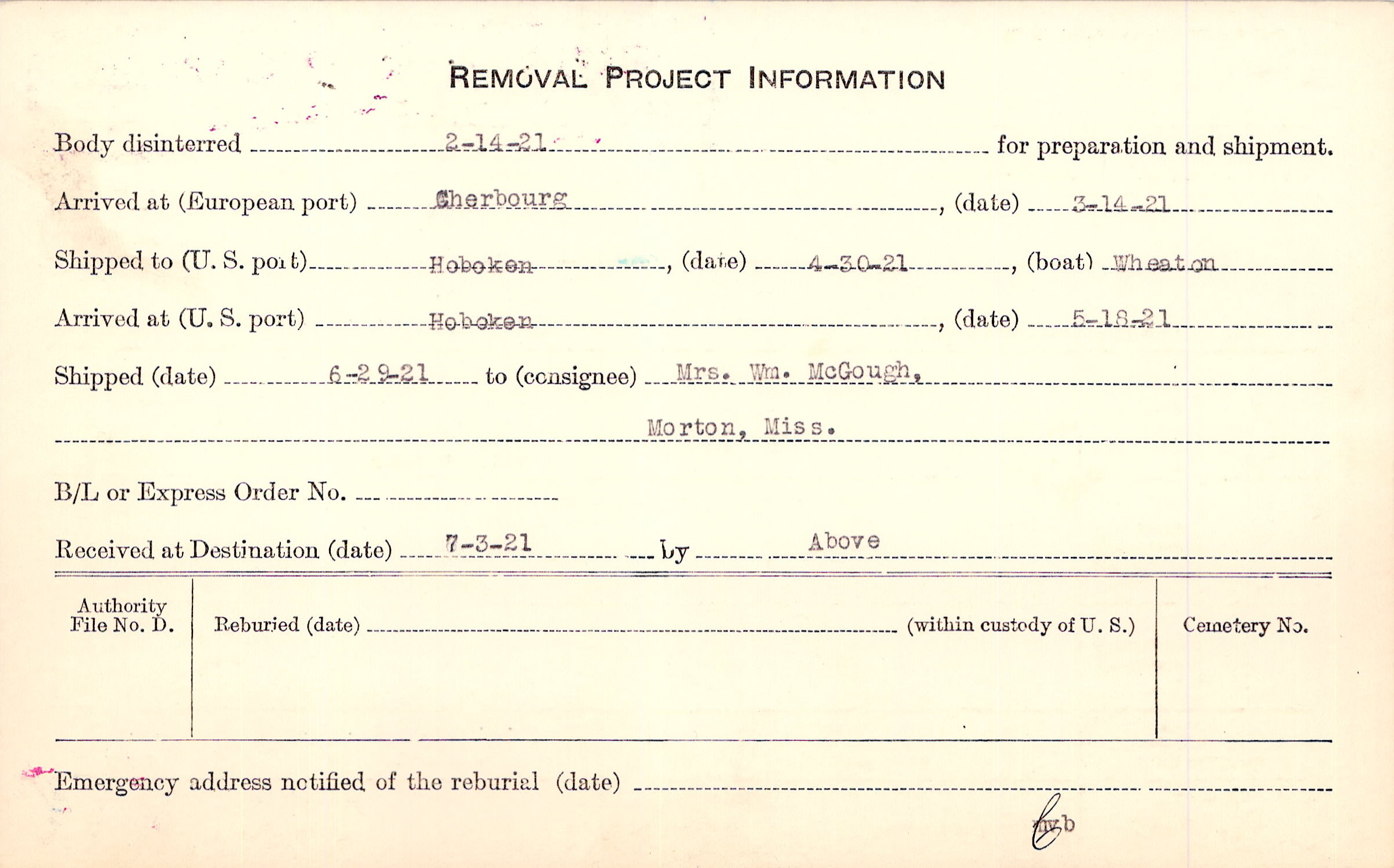 Body disinterred 2/14/1921 for preparation and shipment.