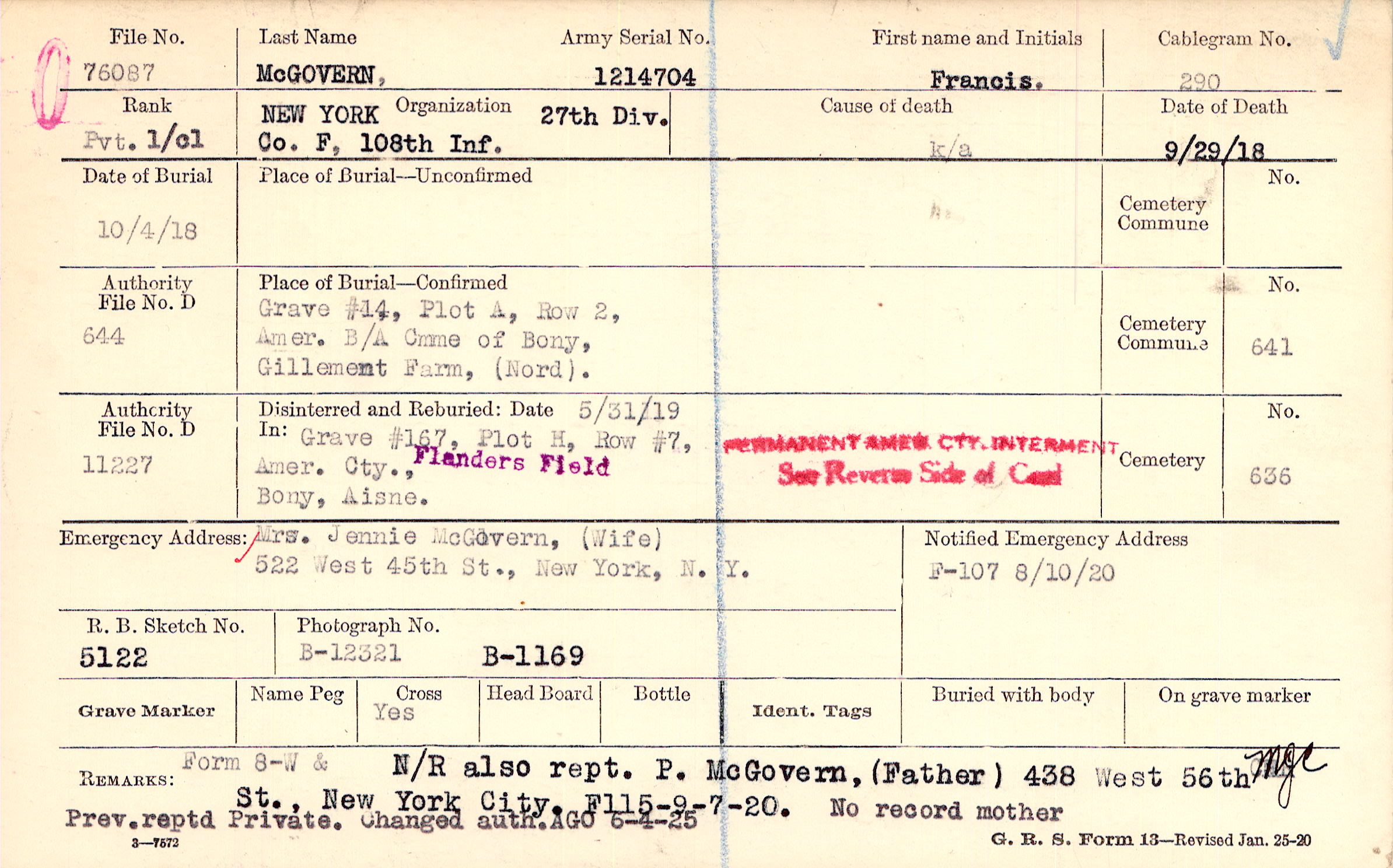 Mrs. Jennie McGovern, (Wife), 522 West 45th St., New York, N.Y.