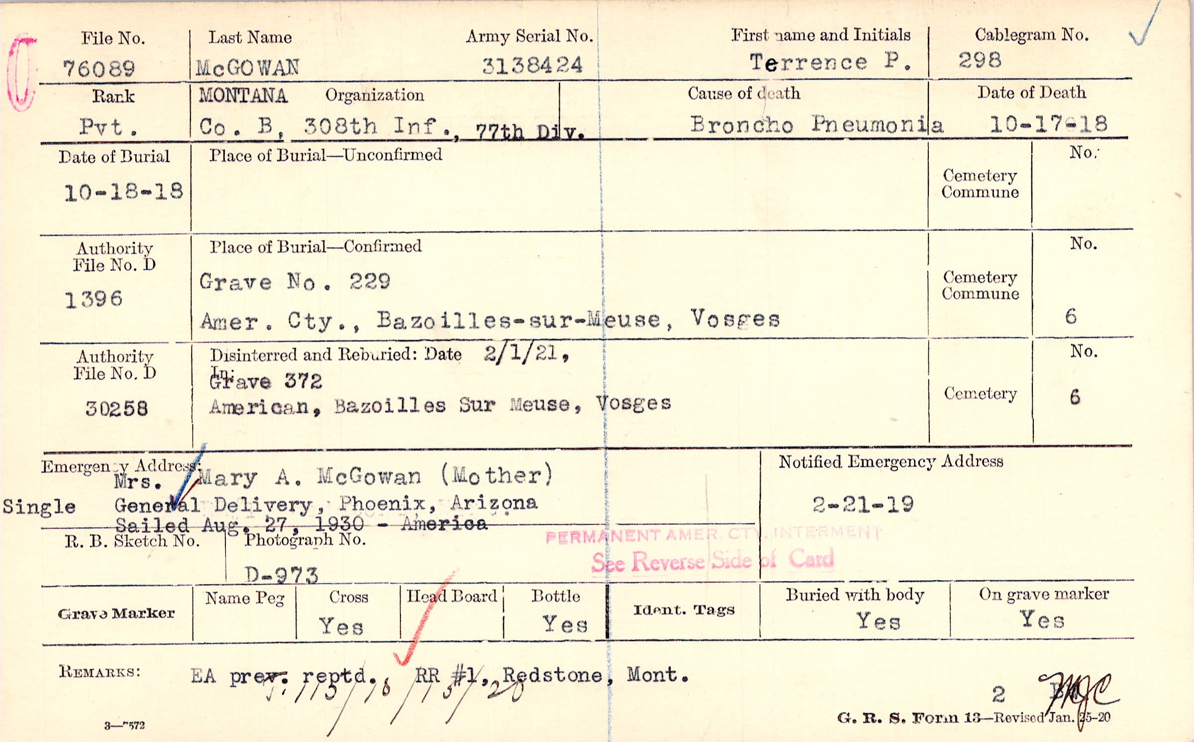Mrs. Mary A. McGowan (Mother), General Delivery, Phoenix, Arizona, Single Sailed Aug. 27, 1930 - America