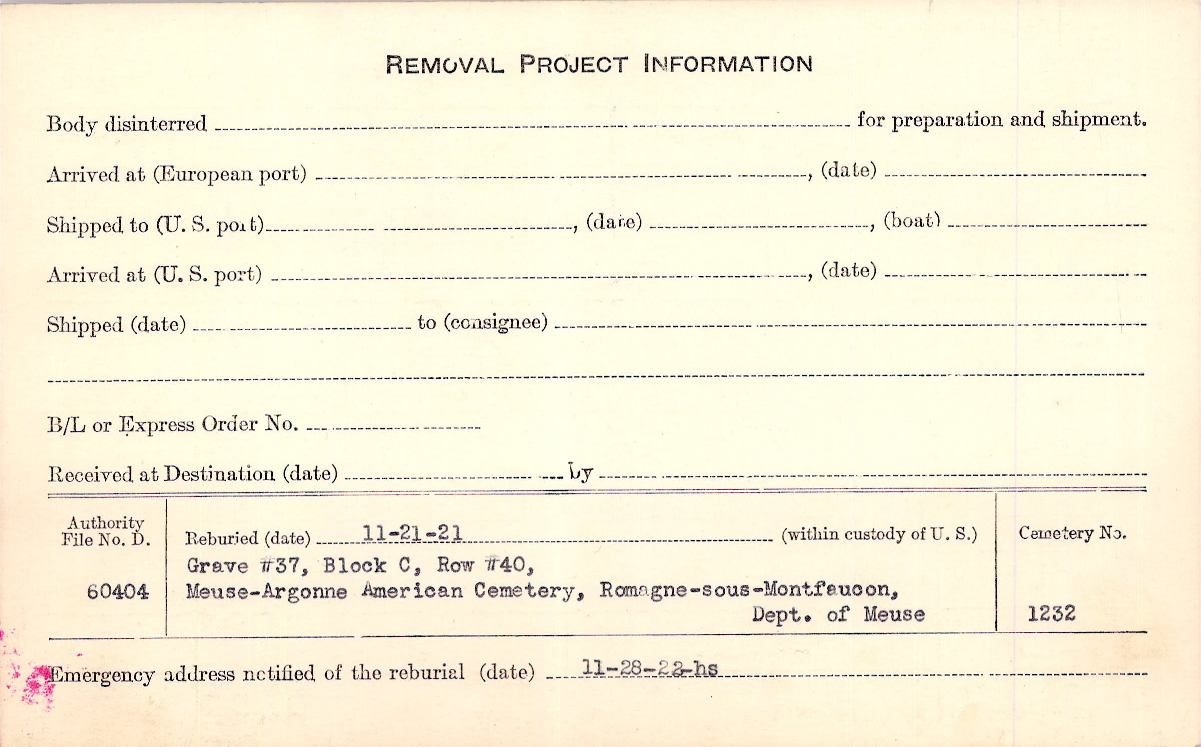 | Permanent Burial in Foreign Cemetery |
