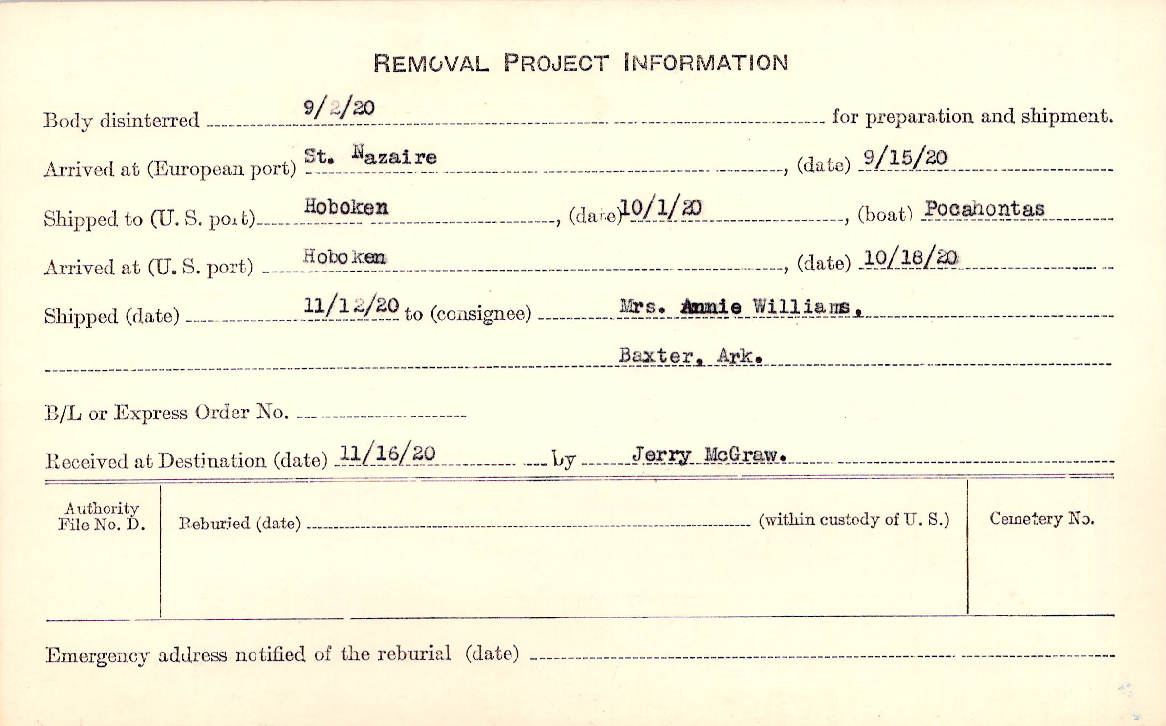 Body disinterred 9/2/1920 for preparation and shipment.