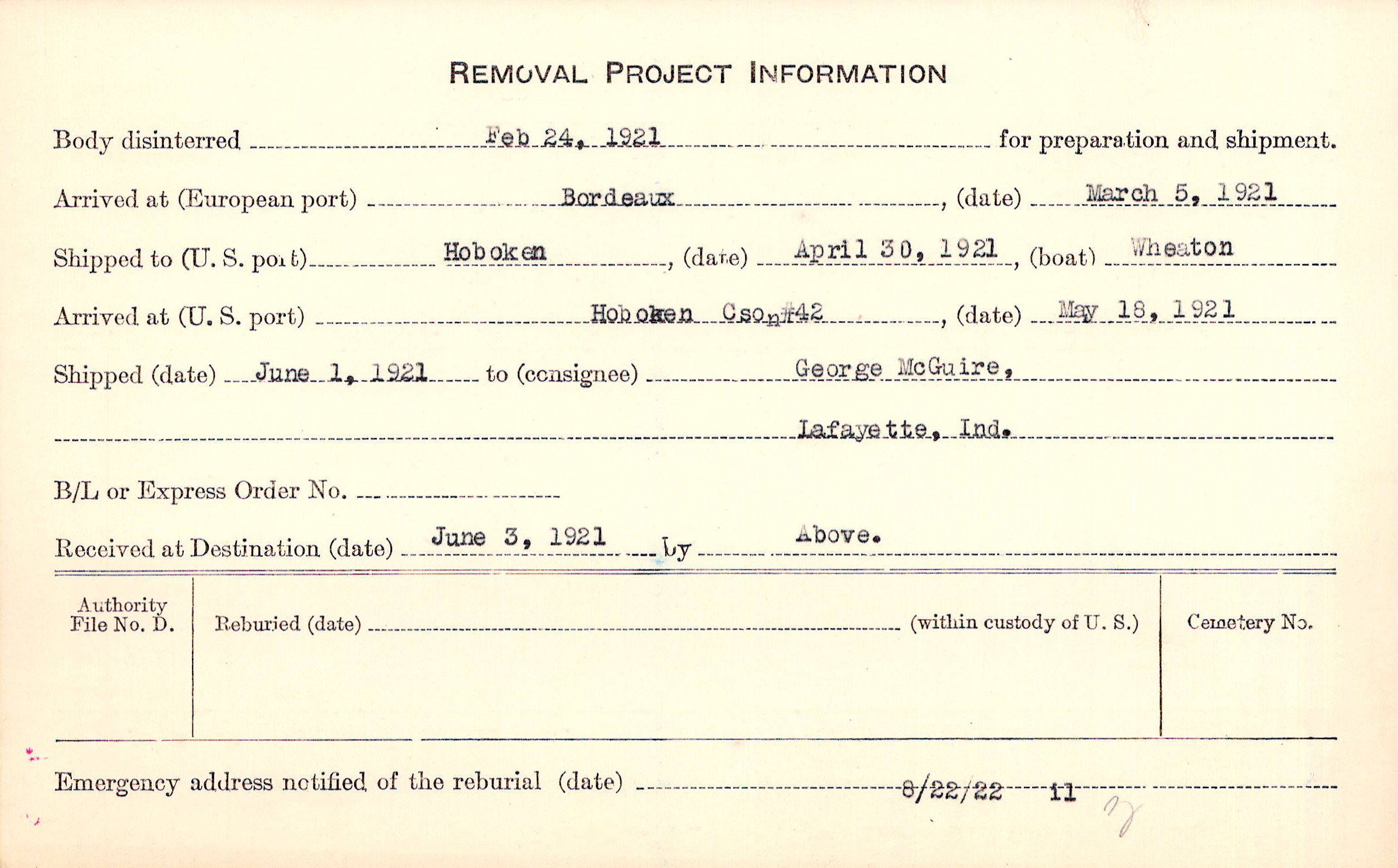 Body disinterred 2/24/1921 for preparation and shipment.