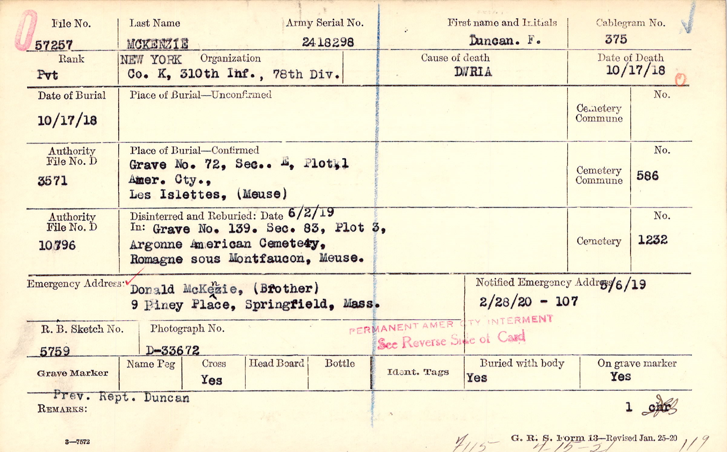 Donald McKenzie, (Brother), 9 Piney Place, Springfield, Mass.