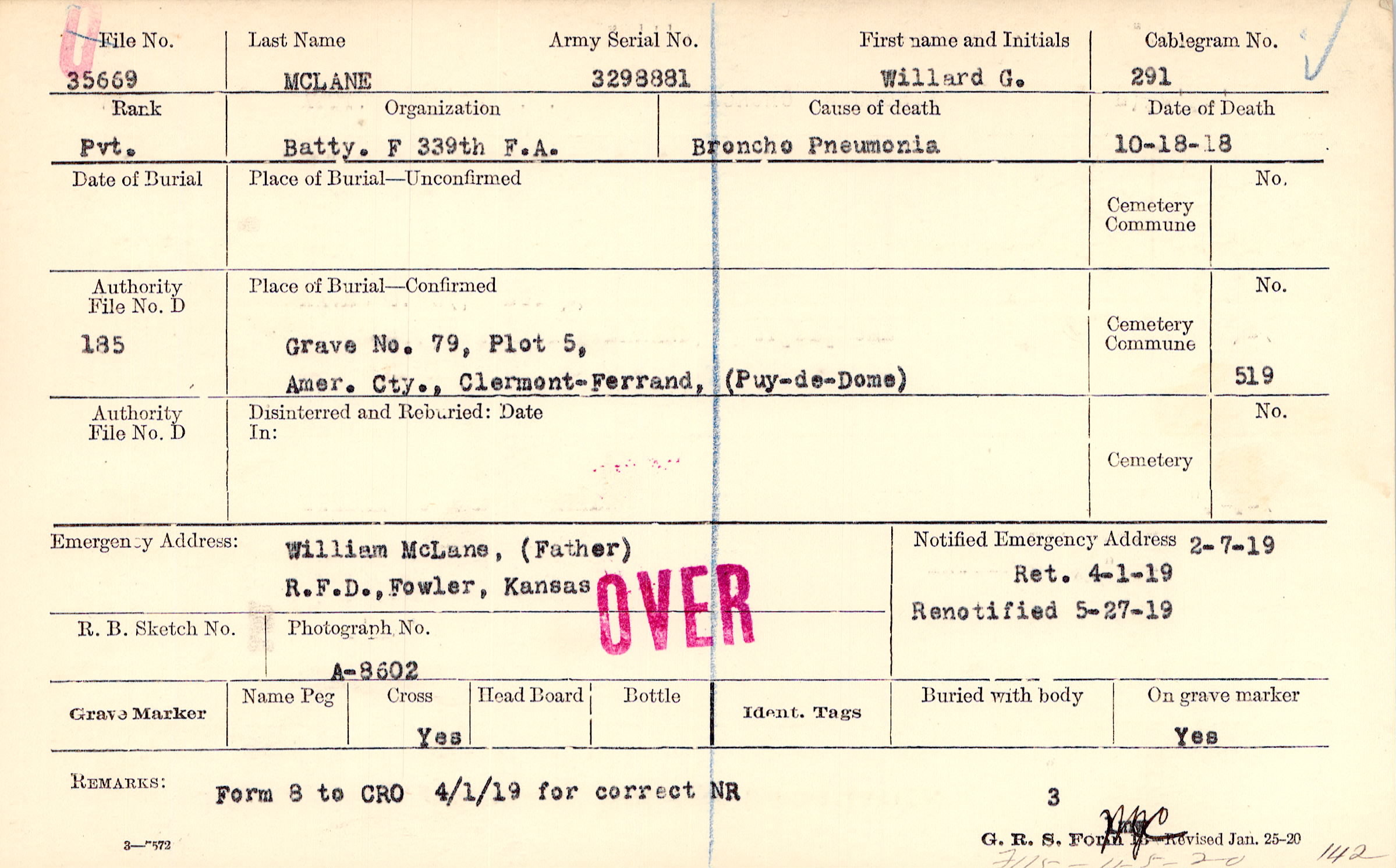 2/7/1919, Ret 4/1/1919, Renotified 5/27/1919