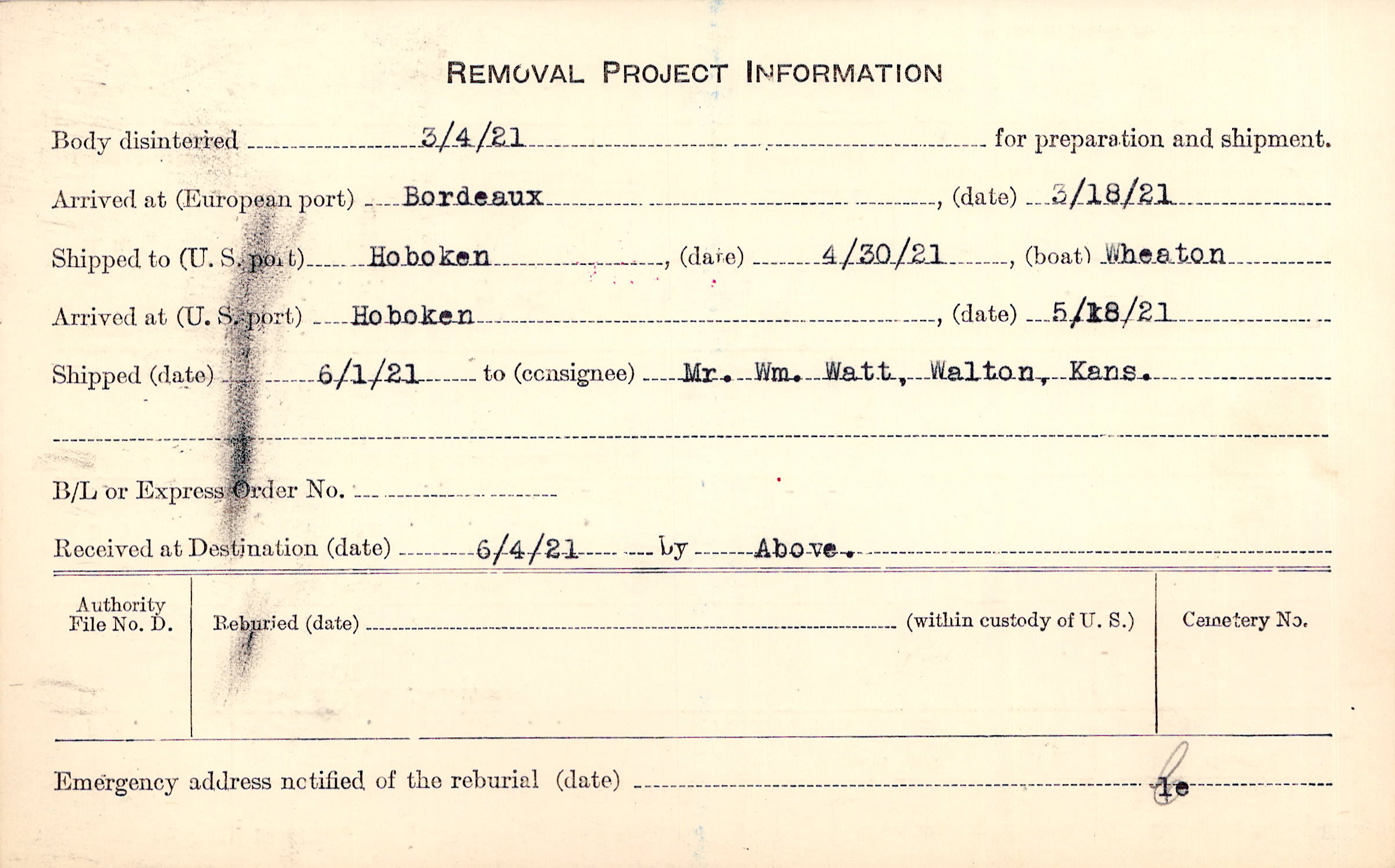 to Mr. Wm. Watt, Walton, Kans.