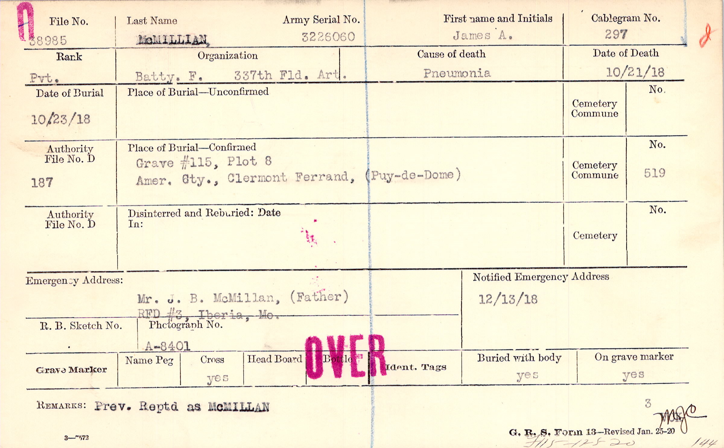 Grave #115, Plot 8, Amer. Cty., Clermont Ferrand, Puy-de-Dome.