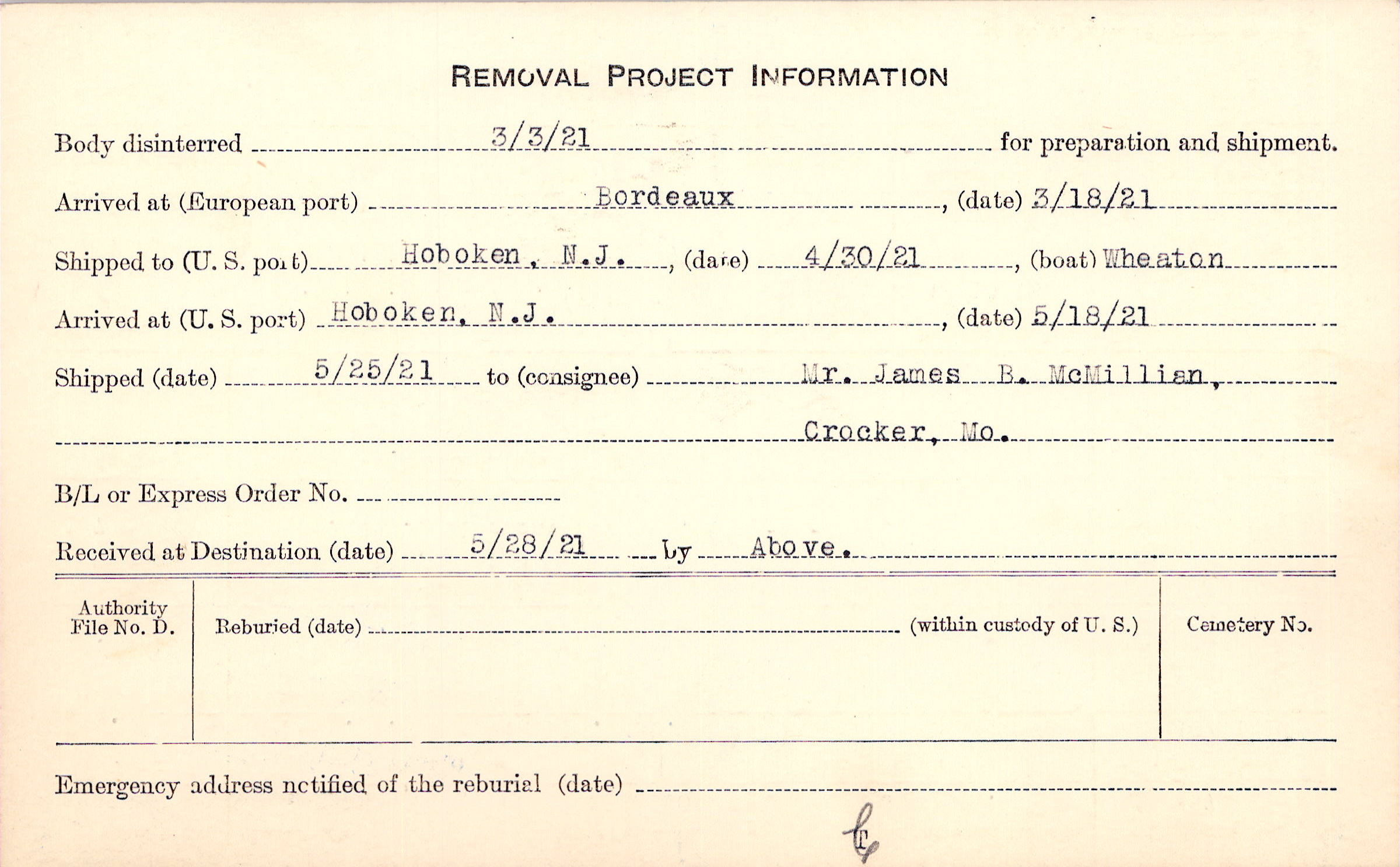 Body disinterred 3/3/1921 for preparation and shipment.