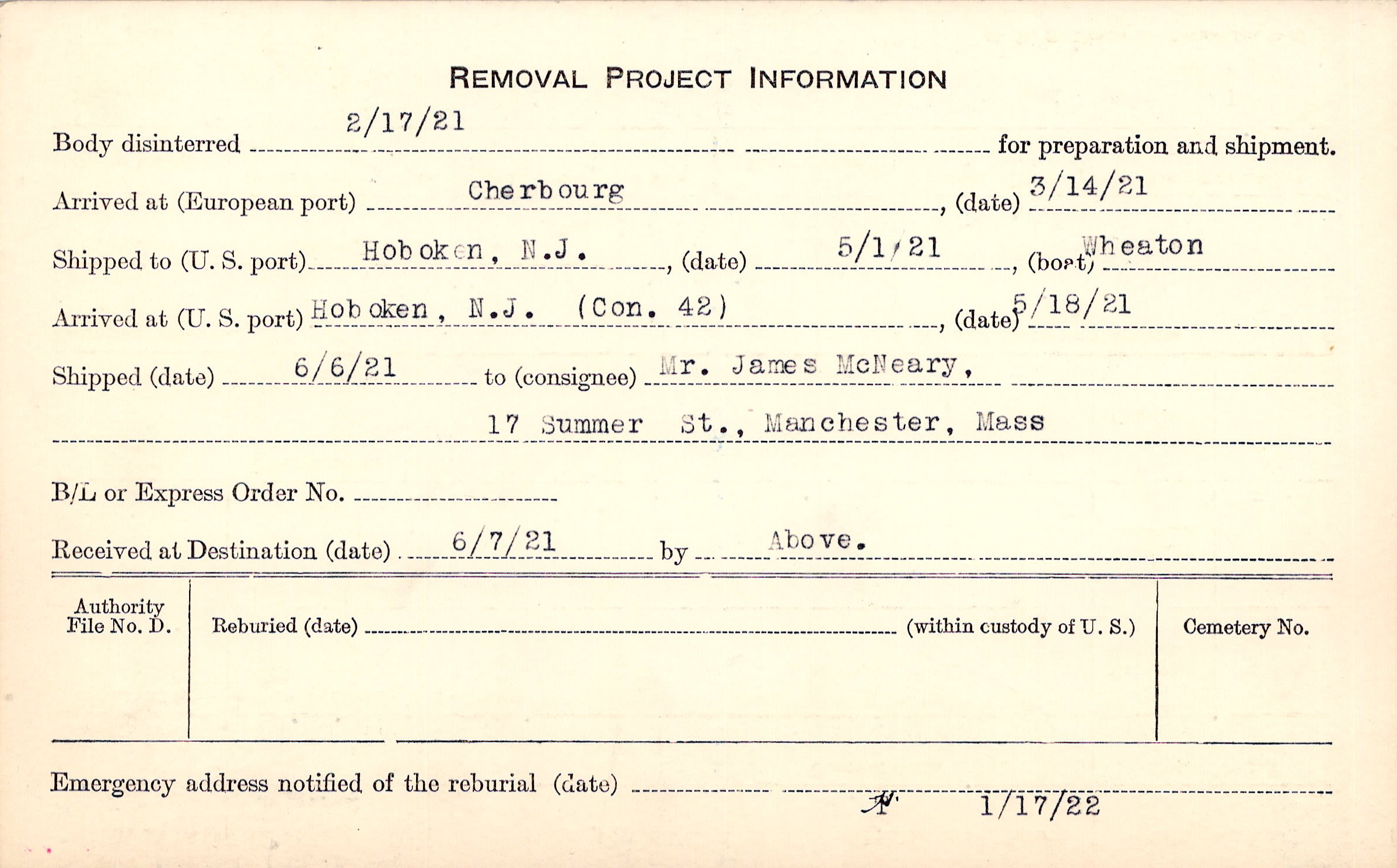 Body disinterred 2/17/1921 for preparation and shipment.