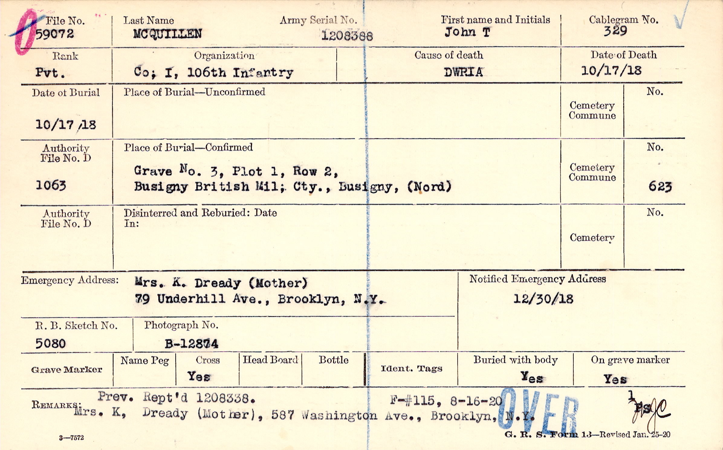 Prev. Rept'd 1208338. Mrs. K. Dready (Mother), 587 Washington Ave., Brooklyn, N.Y., F-#115, 8-16-20 Mrs. K., Dready (Mother), 587 Washington Ave., Brooklyn, N.Y.