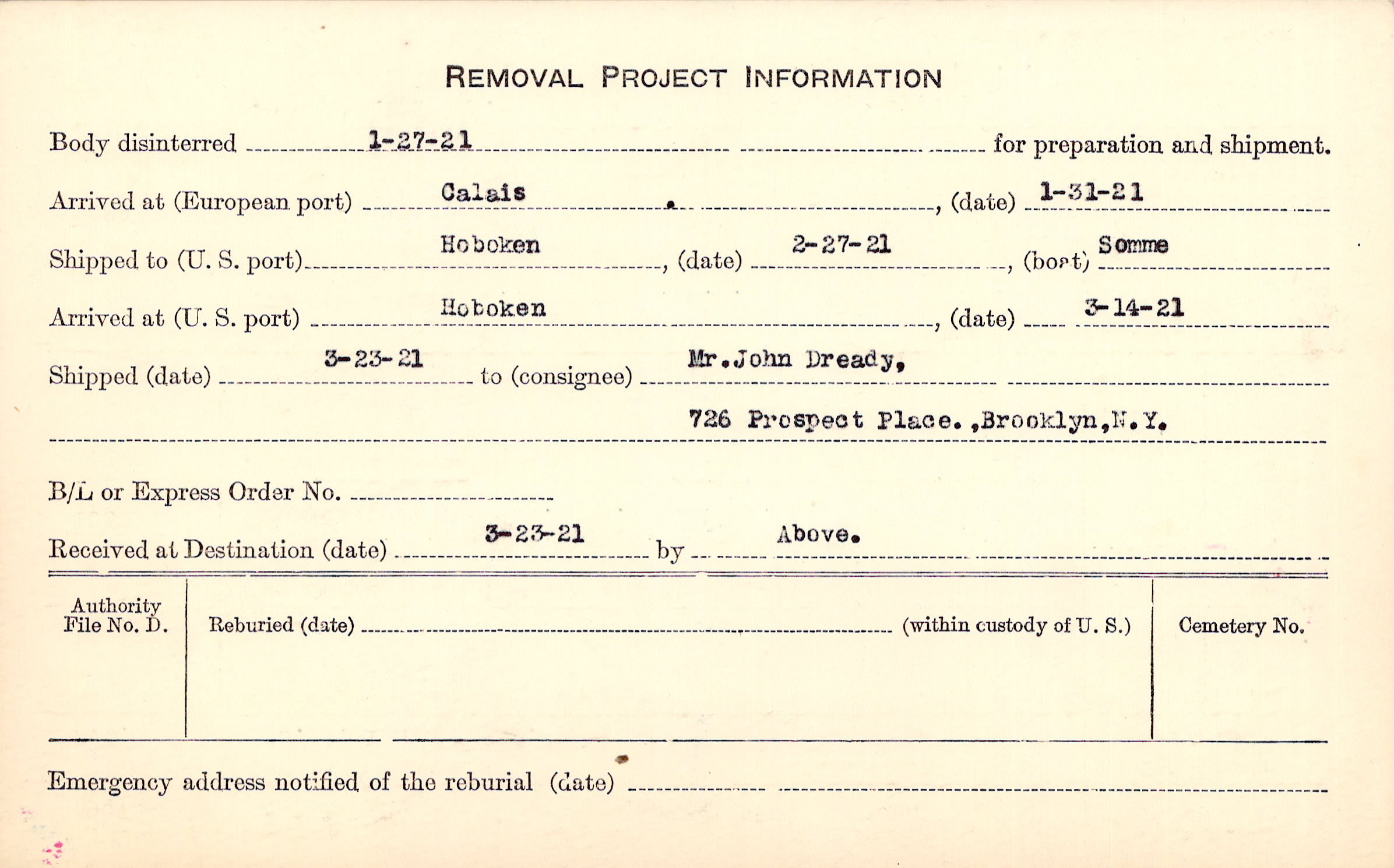 Mrs. K. Dready (Mother), 79 Underhill Ave., Brooklyn, N.Y.