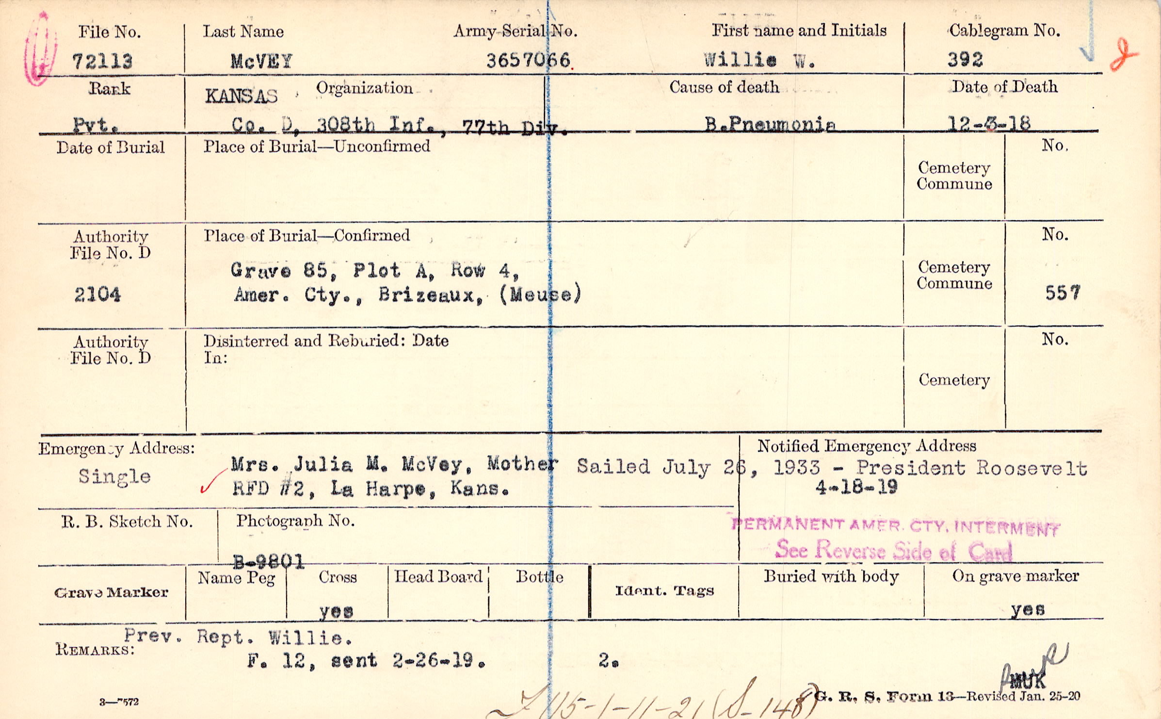 Grave 85, Plot A, Row 4, Amer. Cty., Brizeaux, (Meuse).