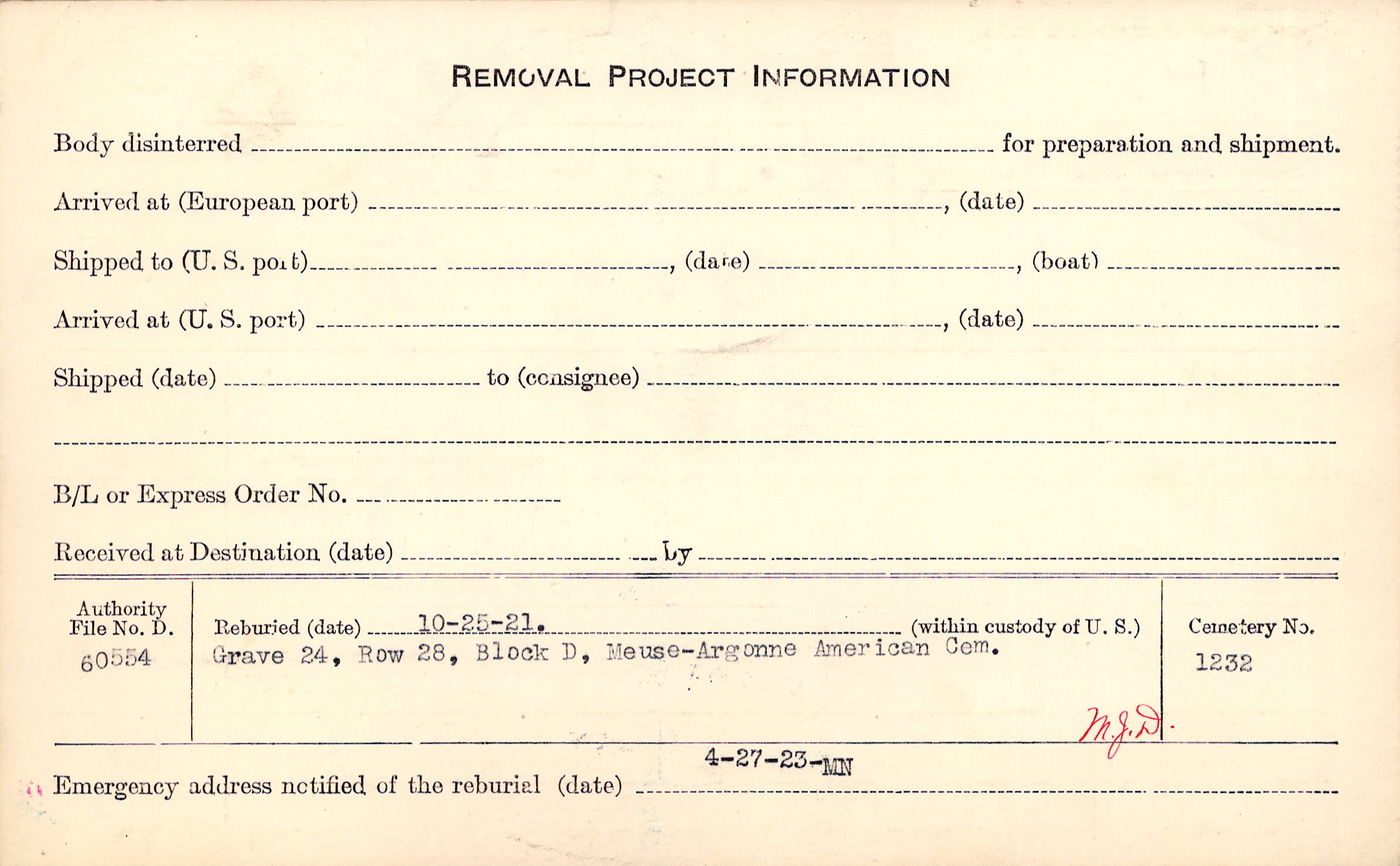 | Permanent Burial in Foreign Cemetery |