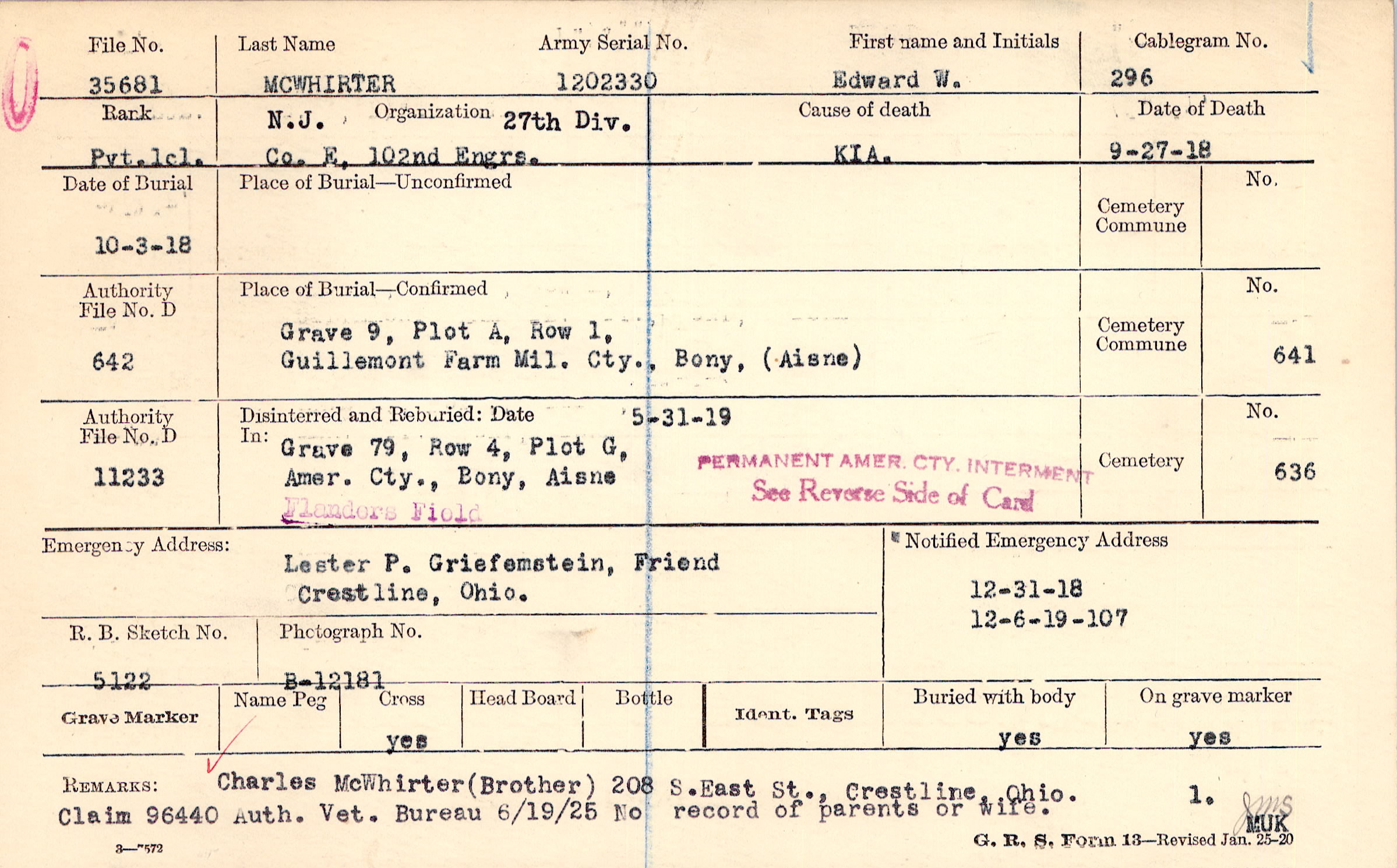 Charles McWhirter (Brother) 208 S.East St., Crestline,. Ohio. Claim 96440 Auth. Vet. Bureau 6/19/25 No record of parents or wife.