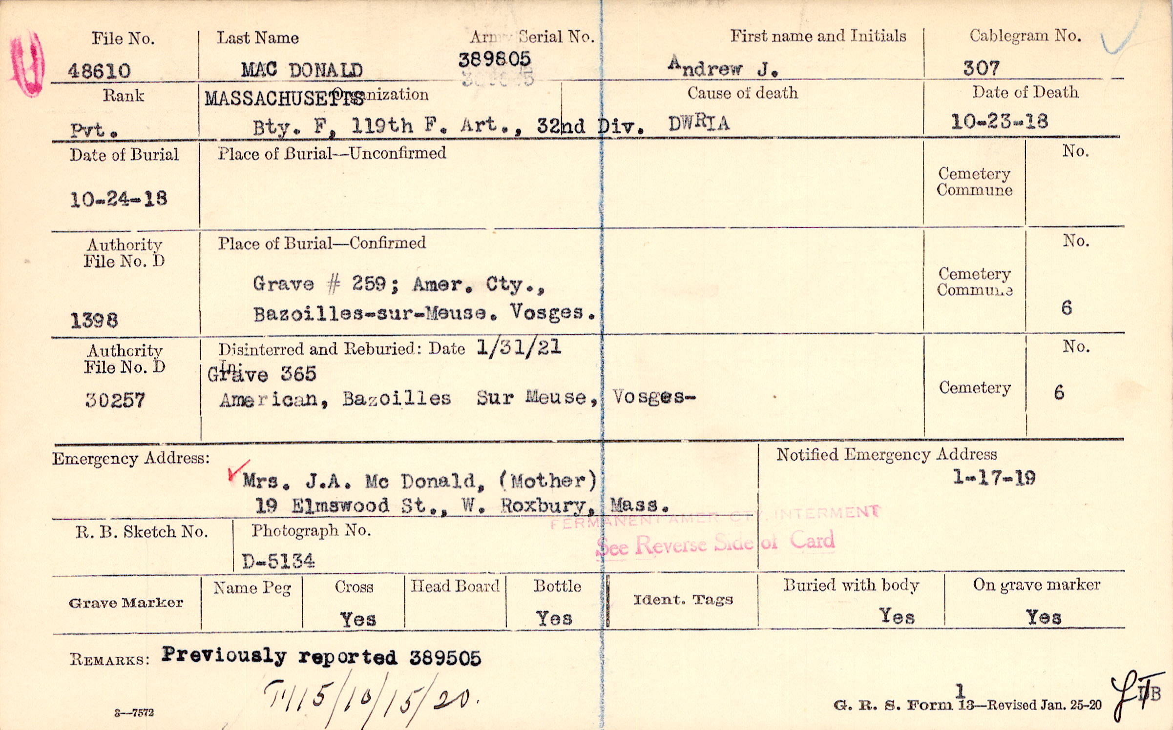 Mrs. J. A. Mc Donald, (Mother), 19 Elmswood St., W. Roxbury, Mass.