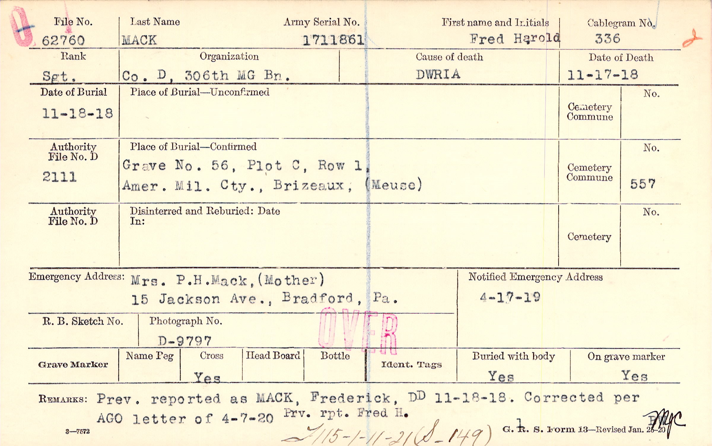 Mrs. P.H.Mack,(Mother), 15 Jackson Ave., Bradford, Pa.