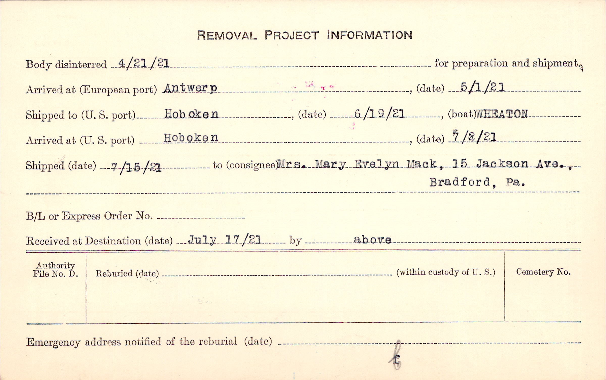 Body disinterred 4/21/1921 for preparation and shipment.