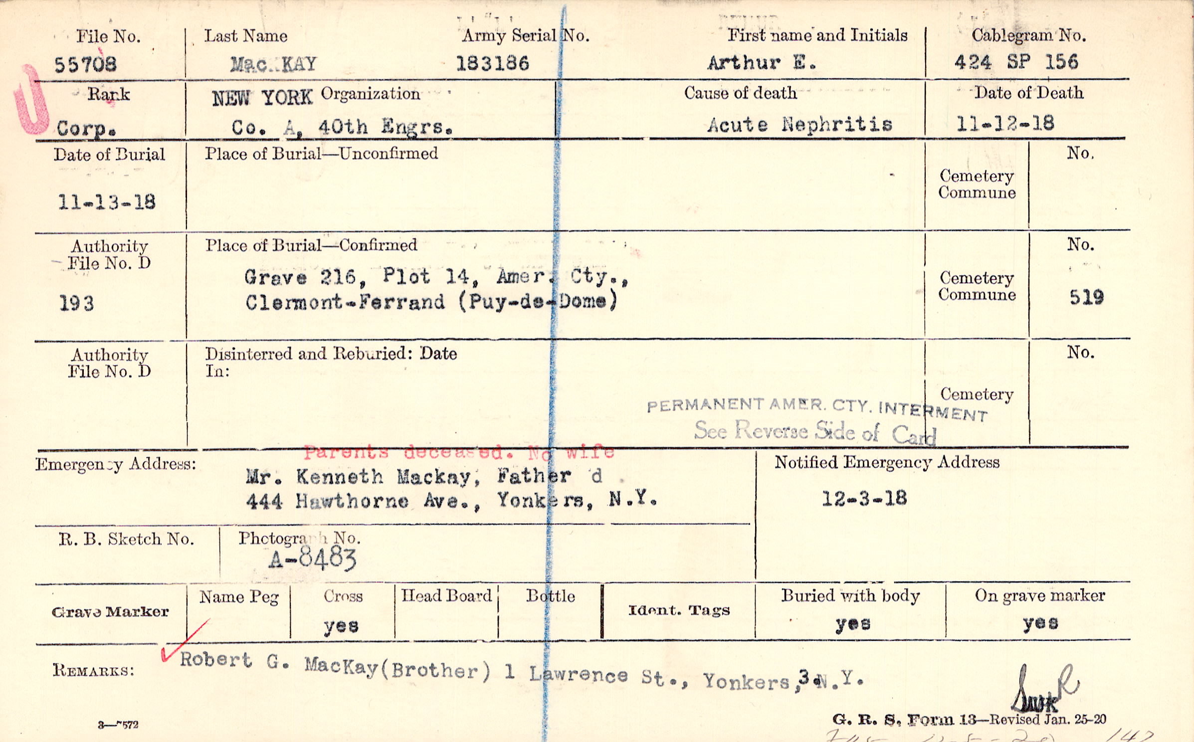 Mr. Kenneth Mackay, Father, 444 Hawthorne Ave., Yonkers, N.Y., Parents deceased. No wife