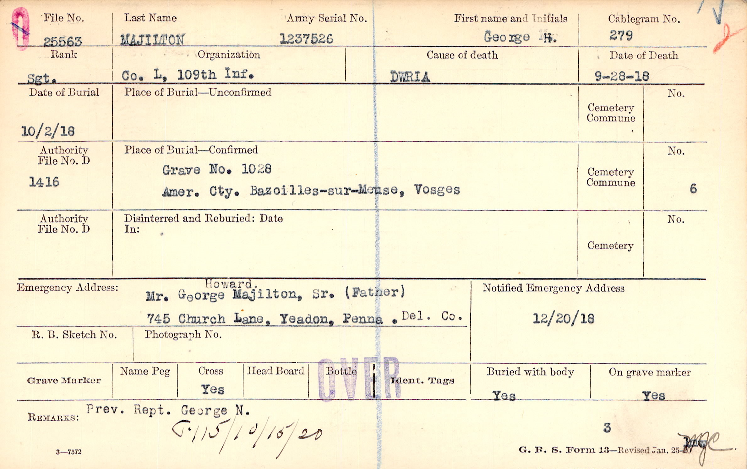 Mr. George Howard Majilton, Sr. (Father), 745 Church Lane, Yeadon, Penna. Del. Co.