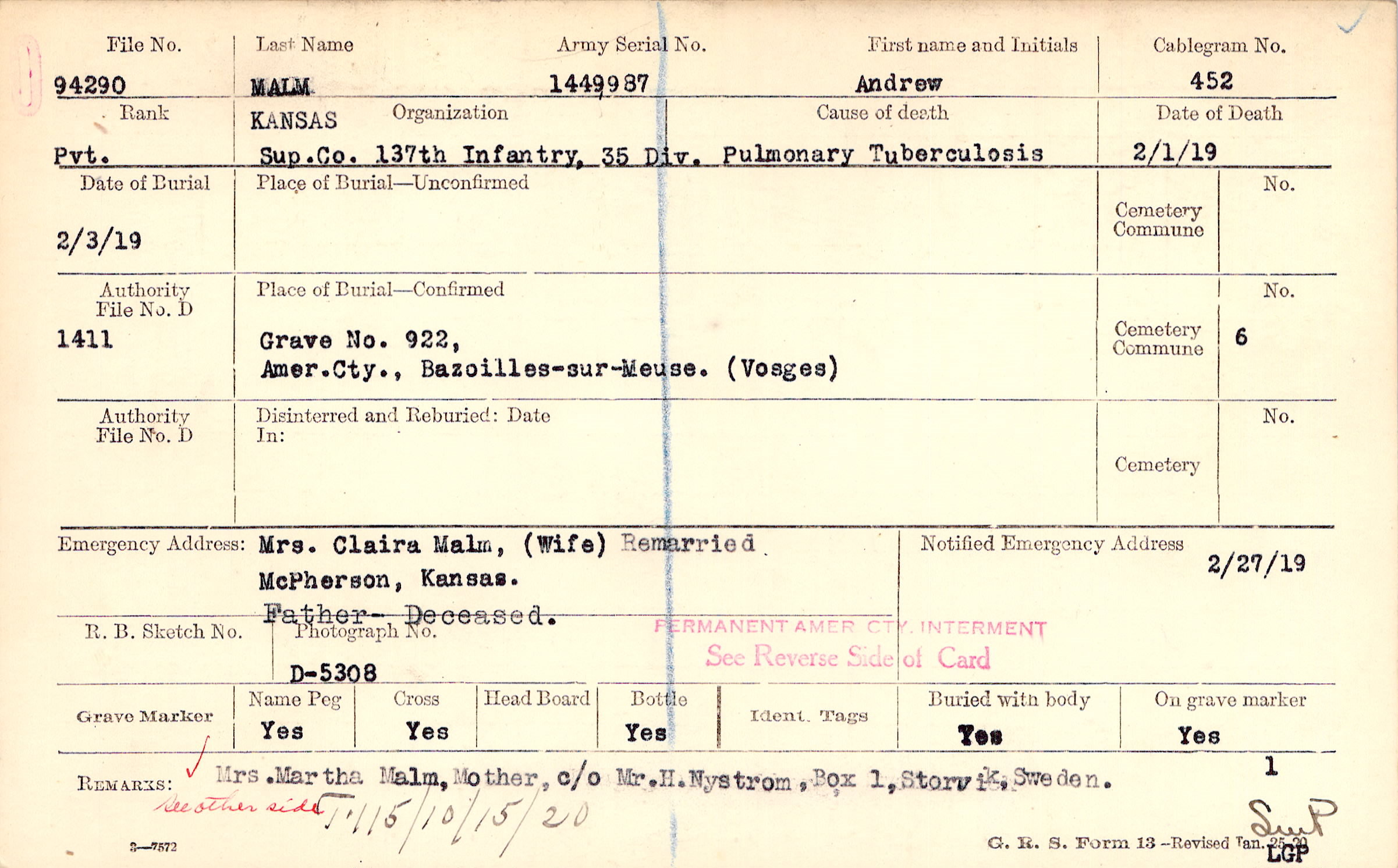 Mrs. Claira Malm, (Wife), McPherson, Kansas., Remarried Father - Deceased.