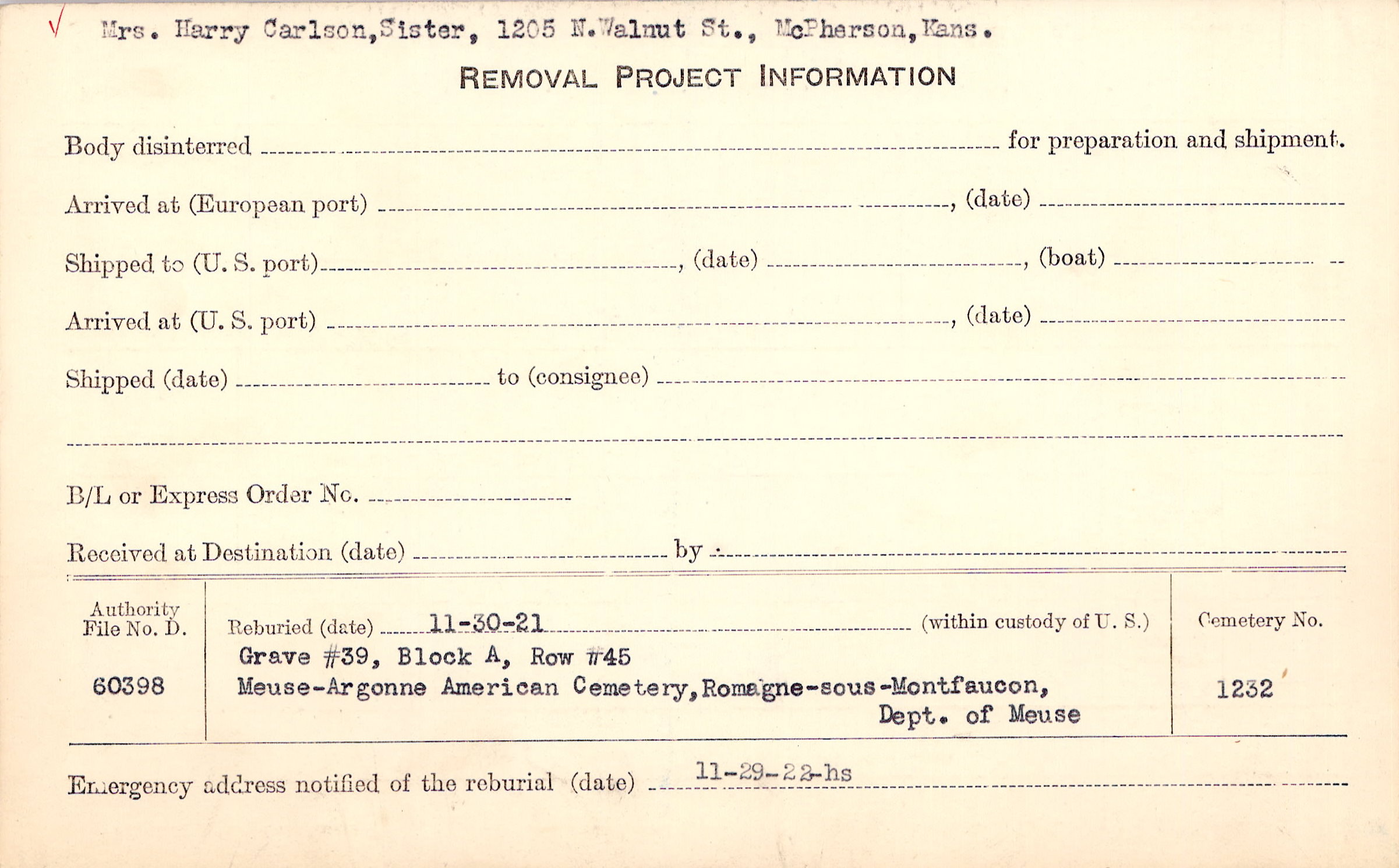 Mrs. Harry Carlson, Sister, 1205 N. Walnut St., McPherson, Kans. |