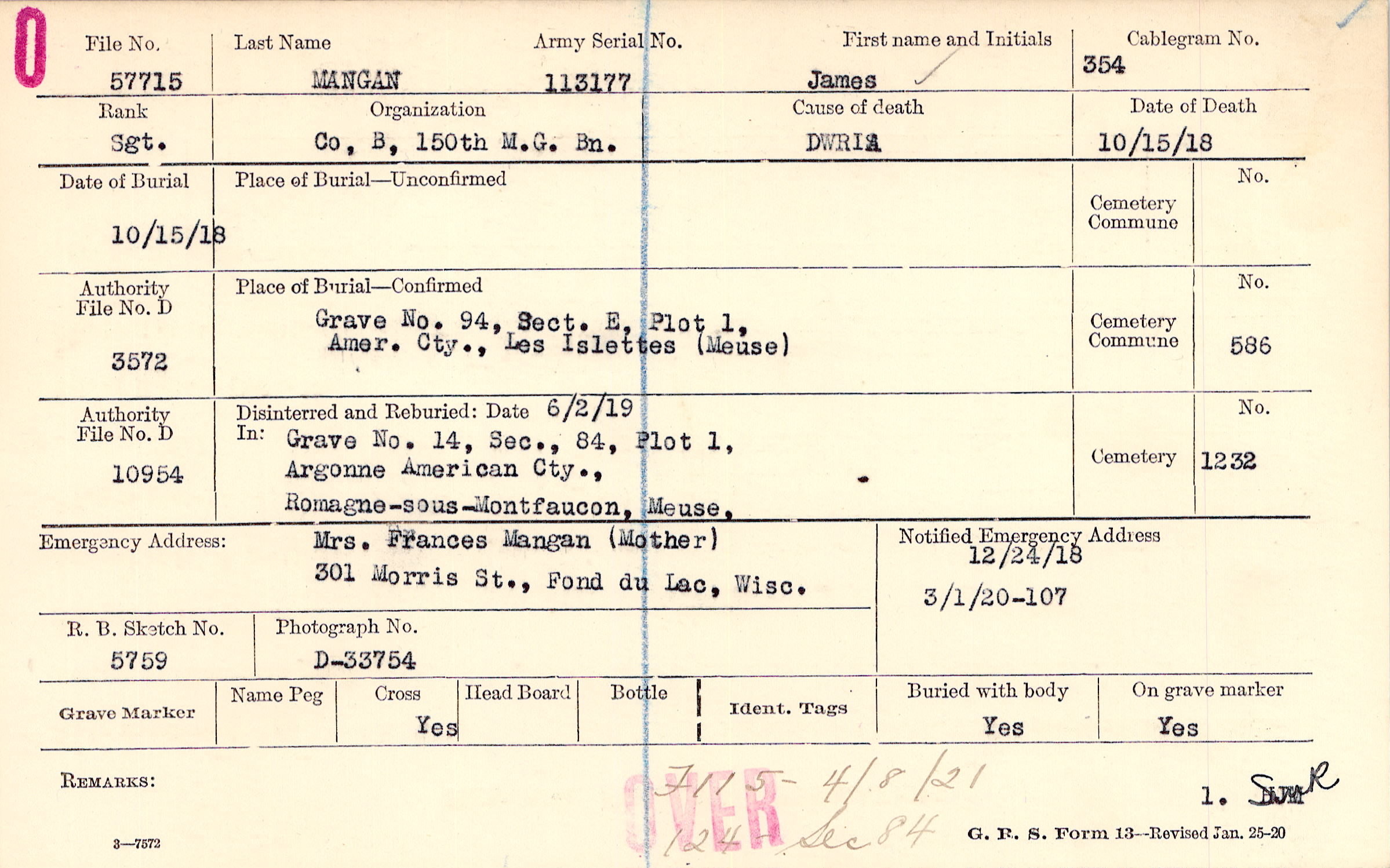 Mrs. Frances Mangan (Mother), 301 Morris St., Fond du Lac, Wisc.