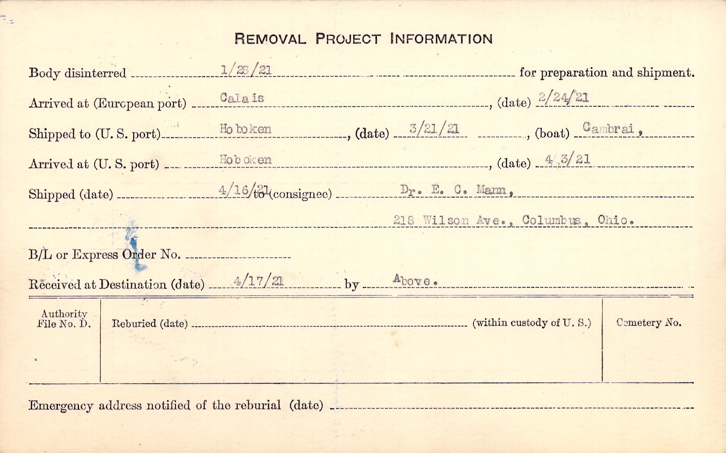 Body disinterred 1/28/1921 for preparation and shipment.