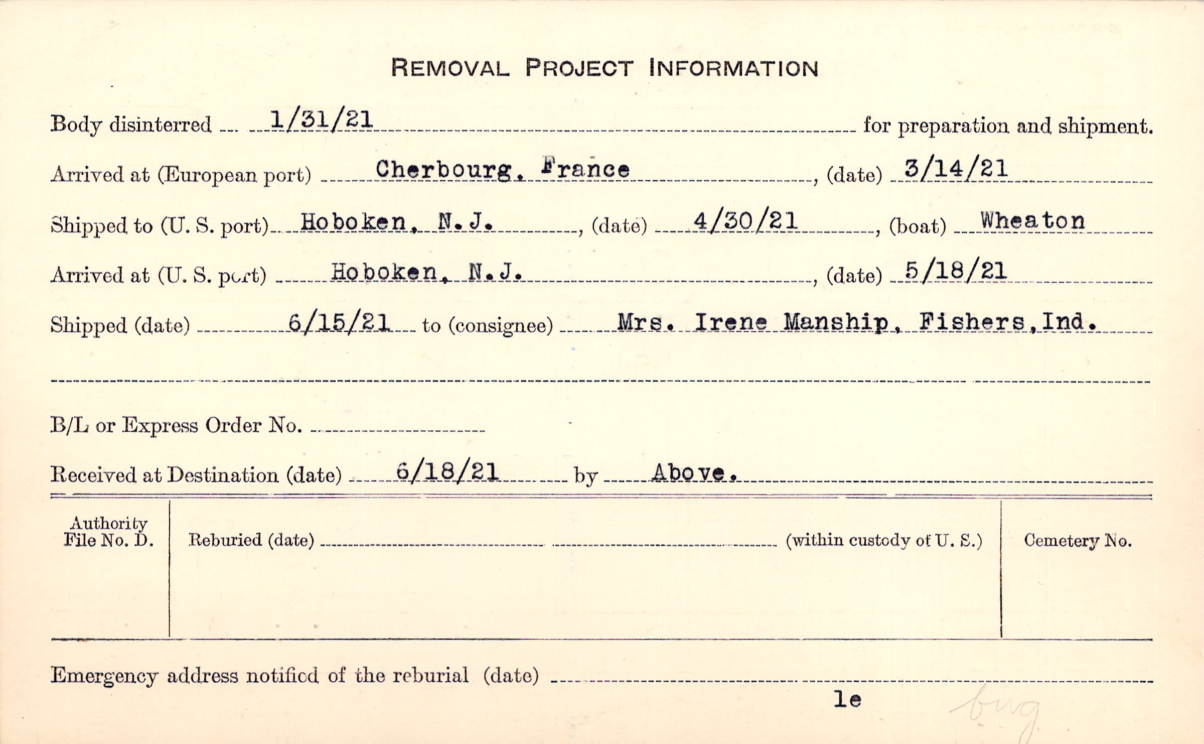 Body disinterred 1/31/1921 for preparation and shipment.