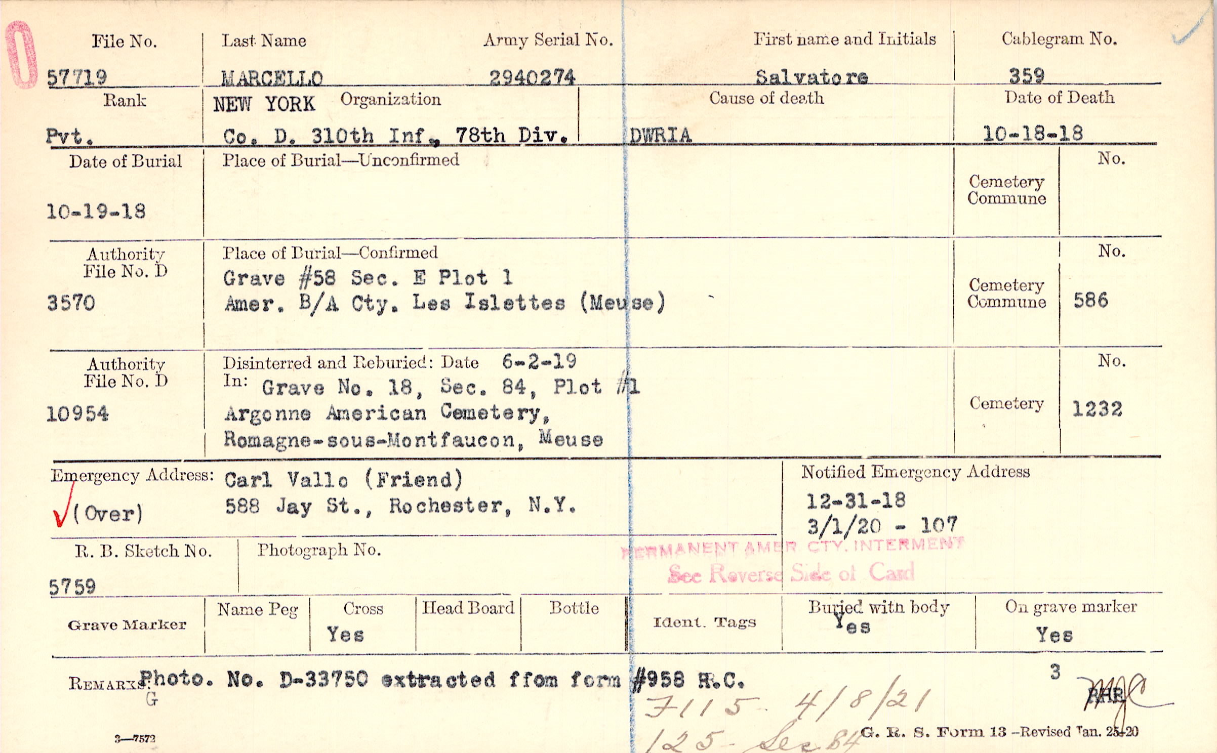 Carl Vallo (Friend), 588 Jay St., Rochester, N.Y., (Over)