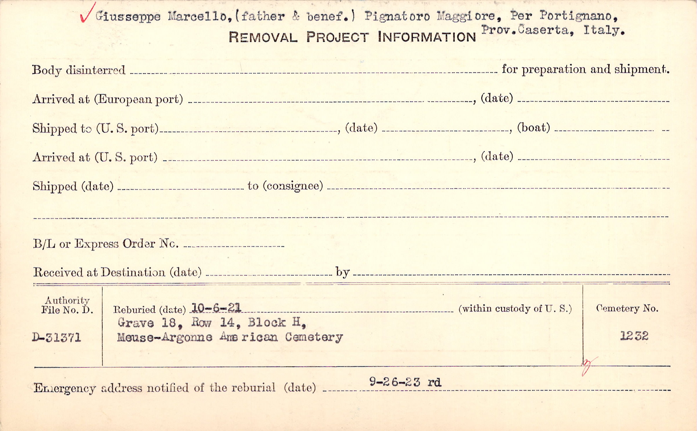 Giusseppe Marcello, (father & benef.) Pignatoro Maggiore, Per Portignano, Prov. Caserta, Italy. |