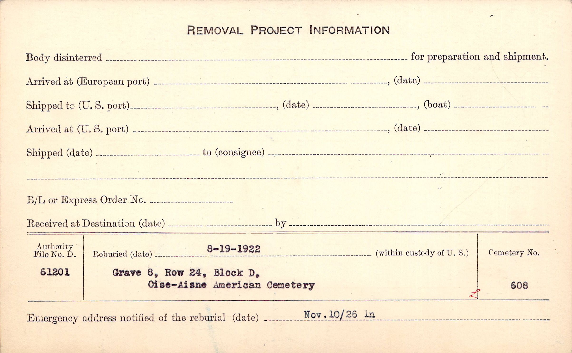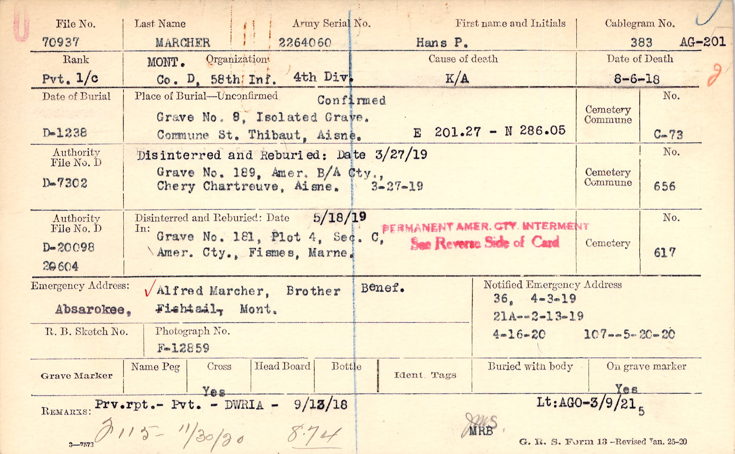 Disinterred and Reburied, Date 3/27/19, Grave 189, Amer. B/A Cty., Chery Chartreuve, Aisne. 3-27-19