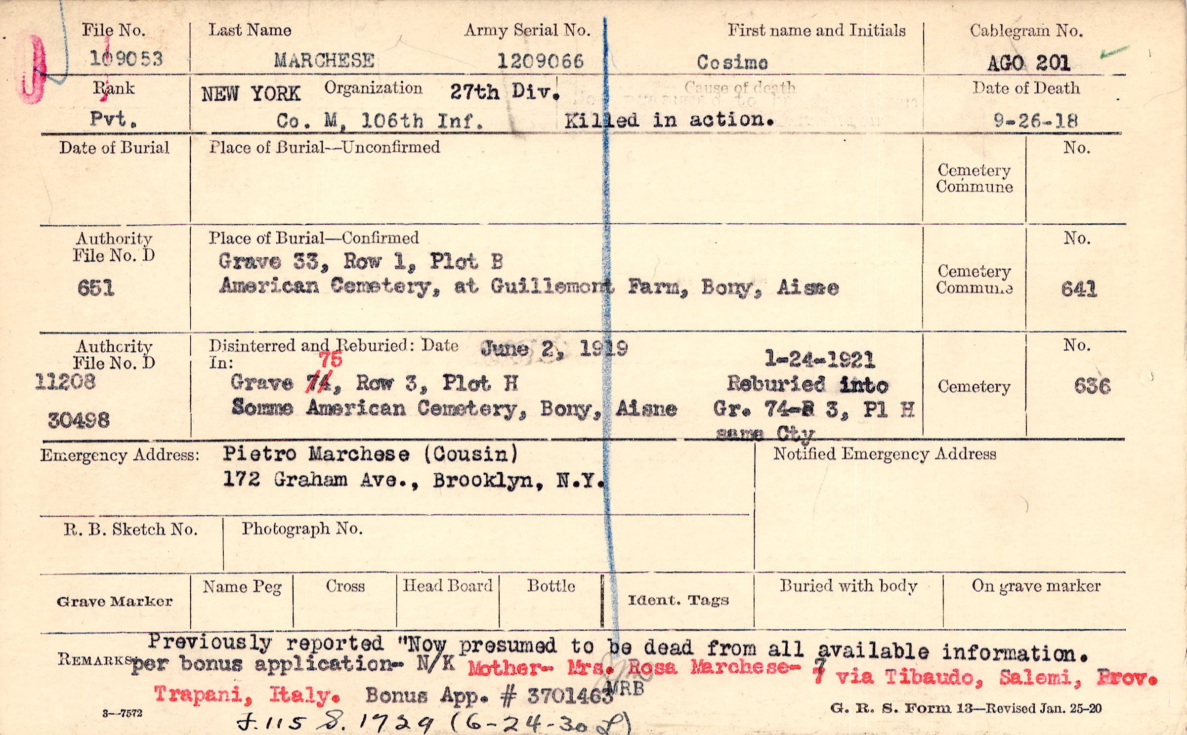 Previously reported "Now presumed to be dead from all available information. per bonus application - N/K Bonus App. # 3701463 Mother - Mrs. Rosa Marchese - 7 via Tibaudo, Salemi, Prov. Trapani, Italy., F.115 S.1729 (6-24-30 L)