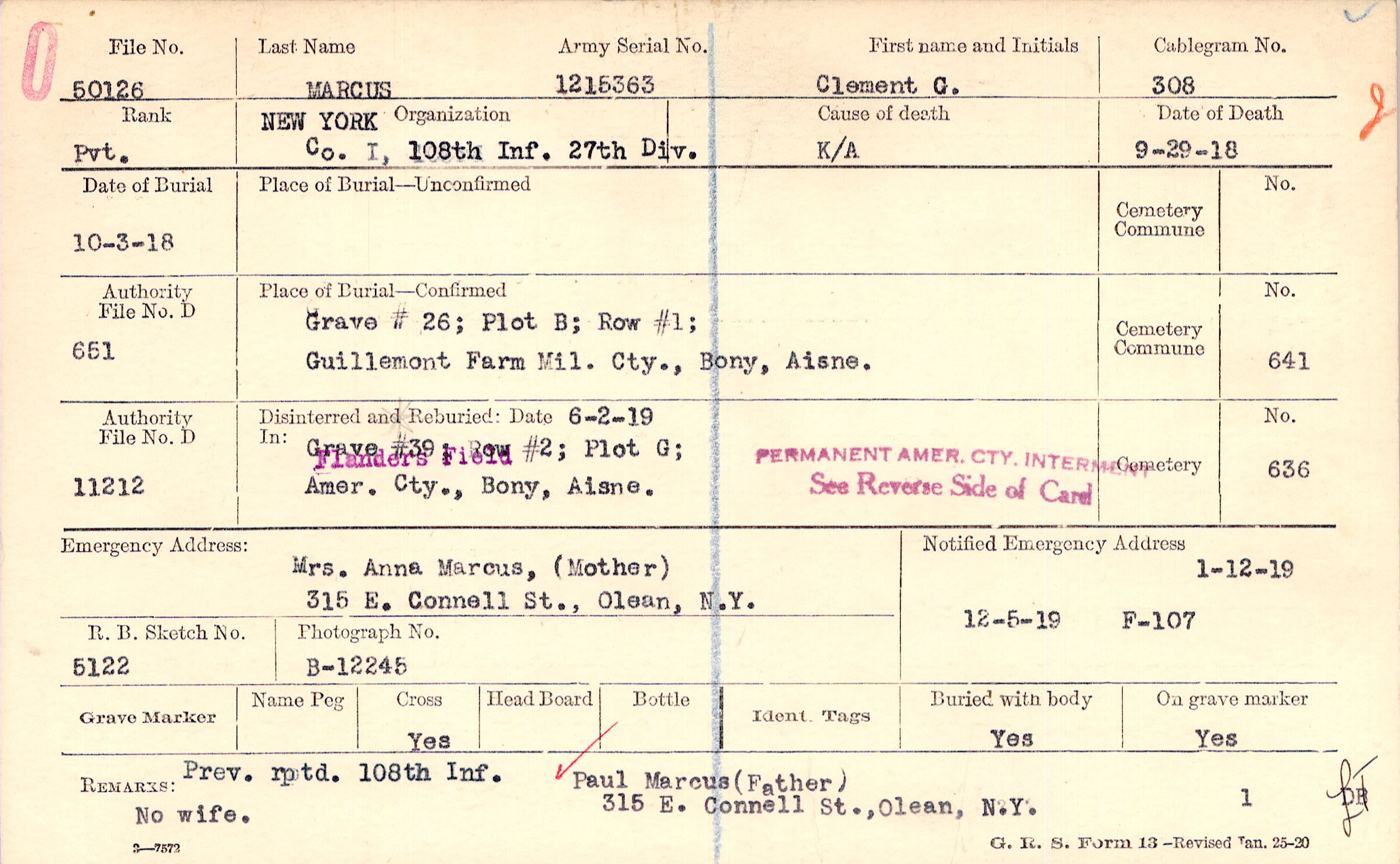Mrs. Anna Marcus, (Mother), 315 E. Connell St., Olean, N.Y.