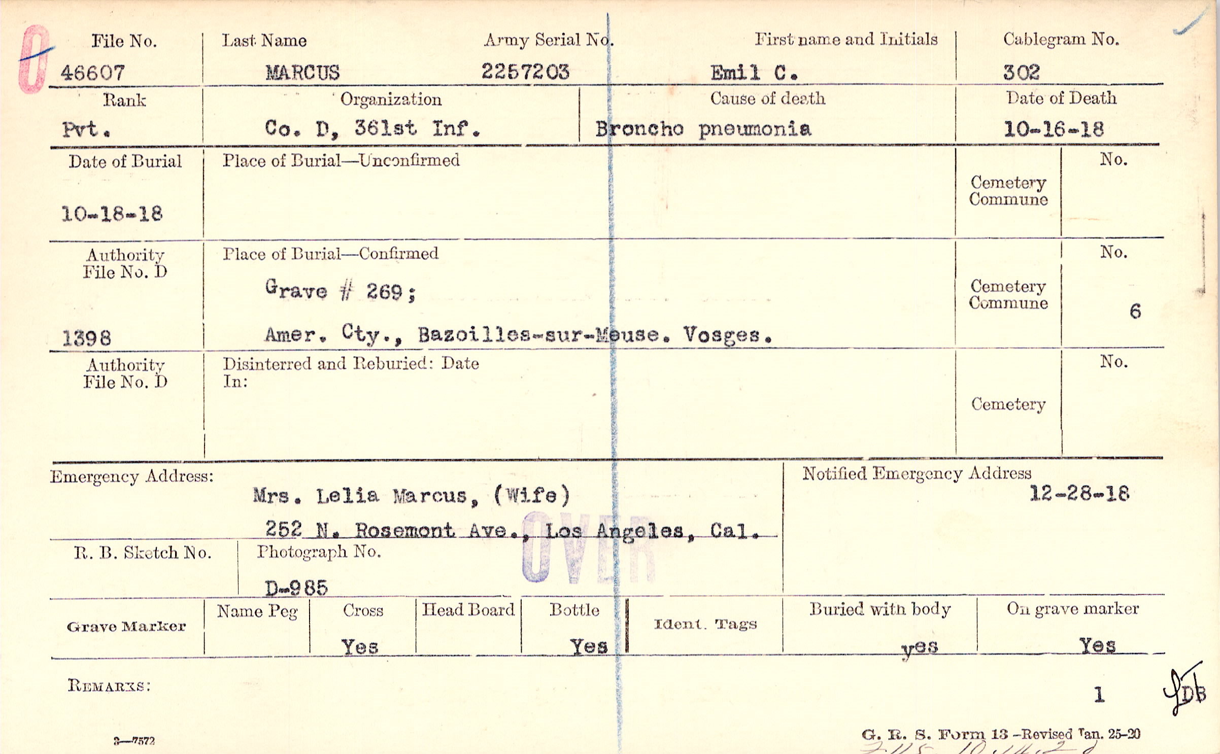 Grave #269, Amer. Cty., Bazoilles-sur-Meuse., Vosges.