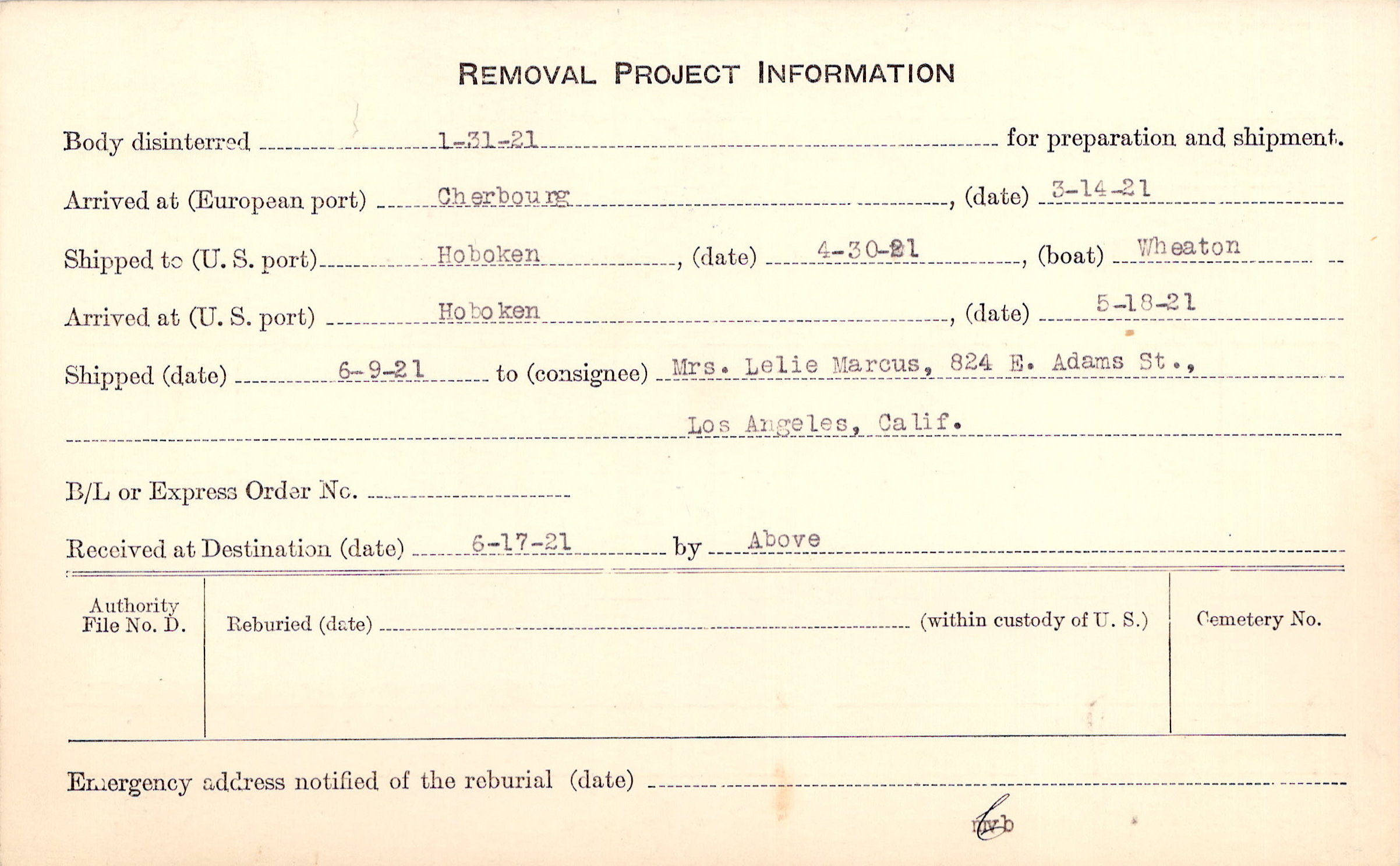Body disinterred 1/31/1921 for preparation and shipment.