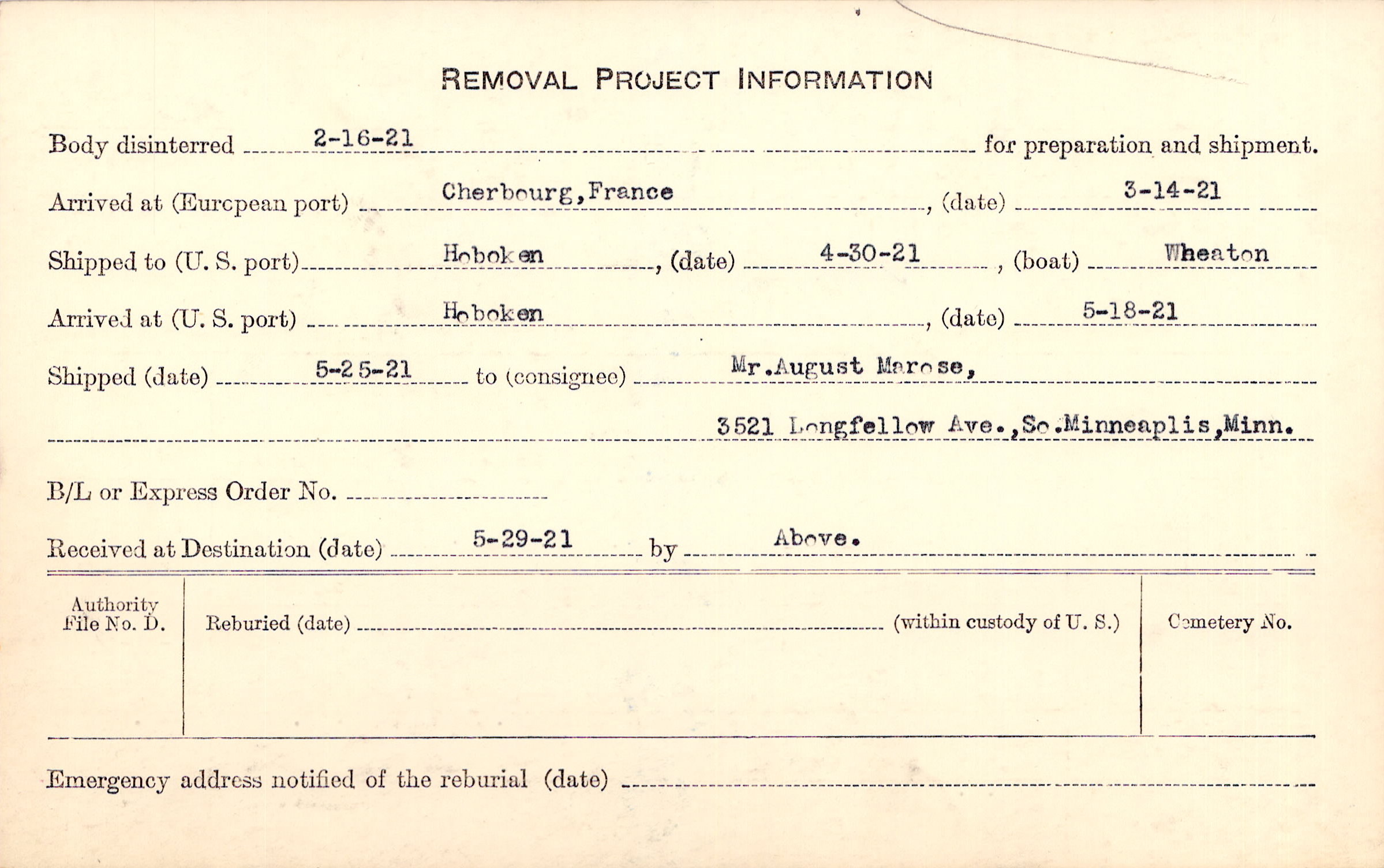 Body disinterred 2/16/1921 for preparation and shipment.