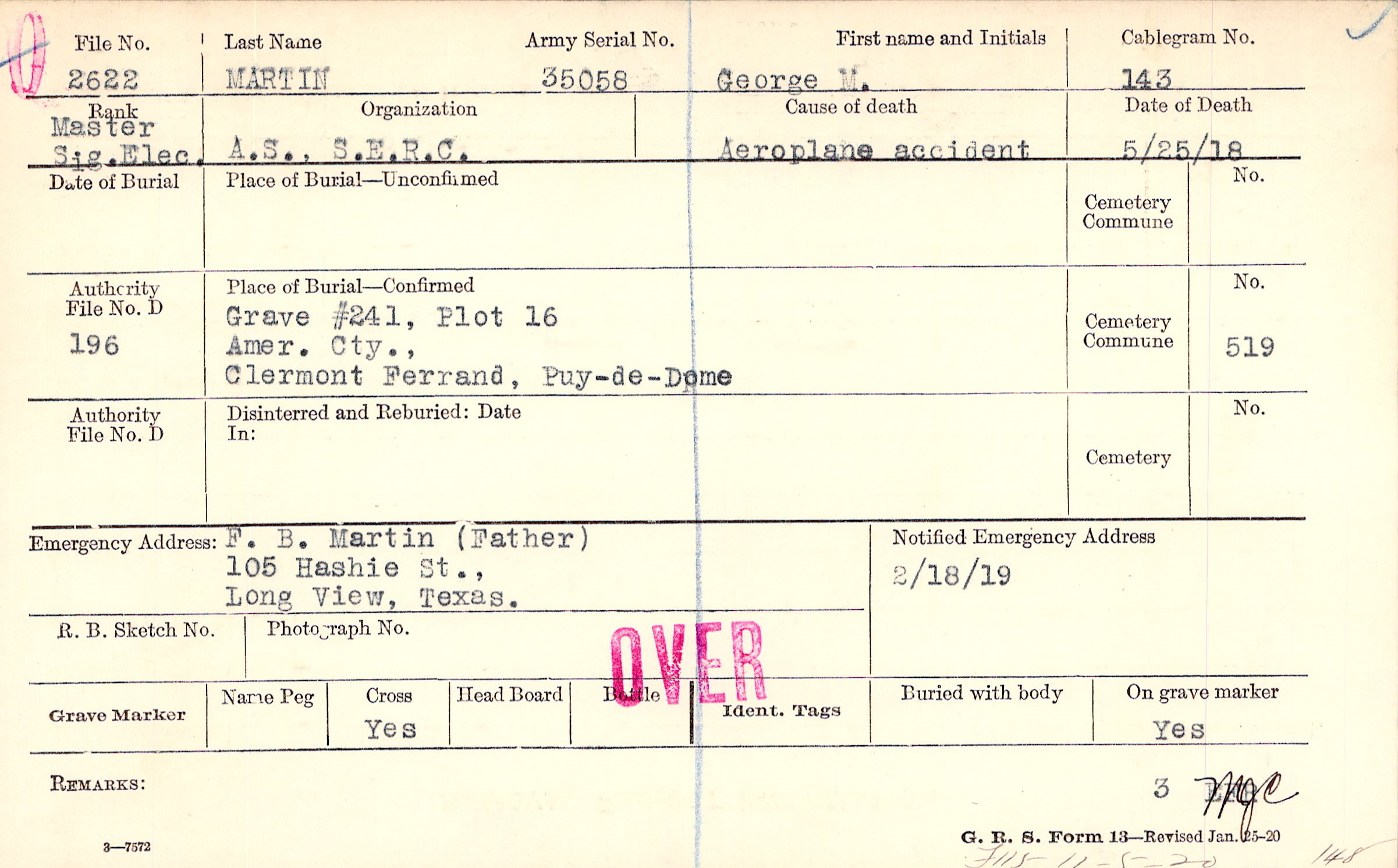 Grave #241, Plot 16, Amer. Cty., Clermont Ferrand, Puy-de-Dome