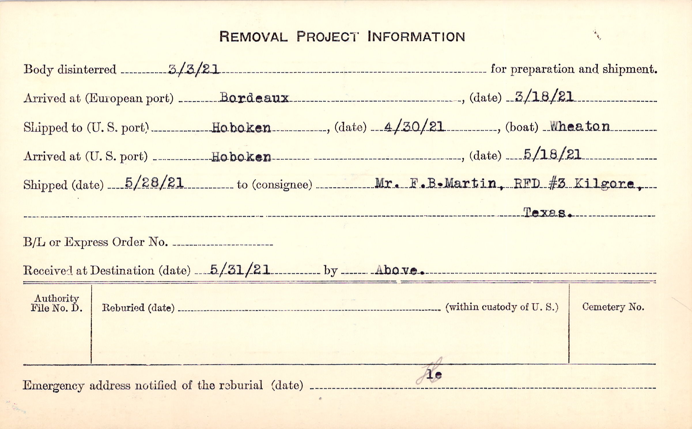 Body disinterred 3/3/1921 for preparation and shipment.