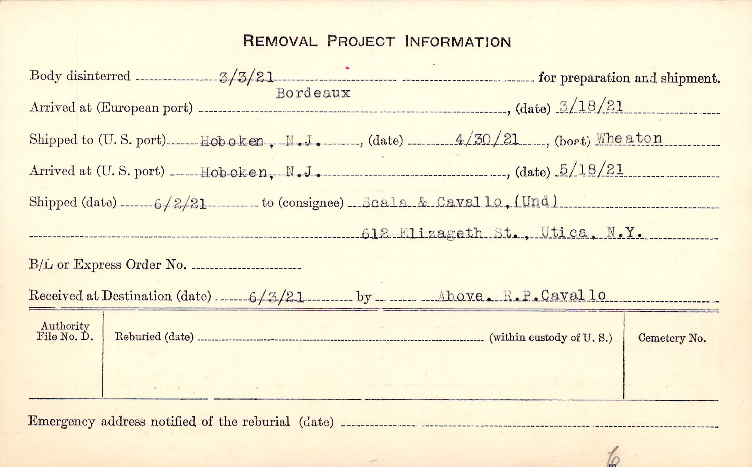 Body disinterred 3/3/1921 for preparation and shipment.