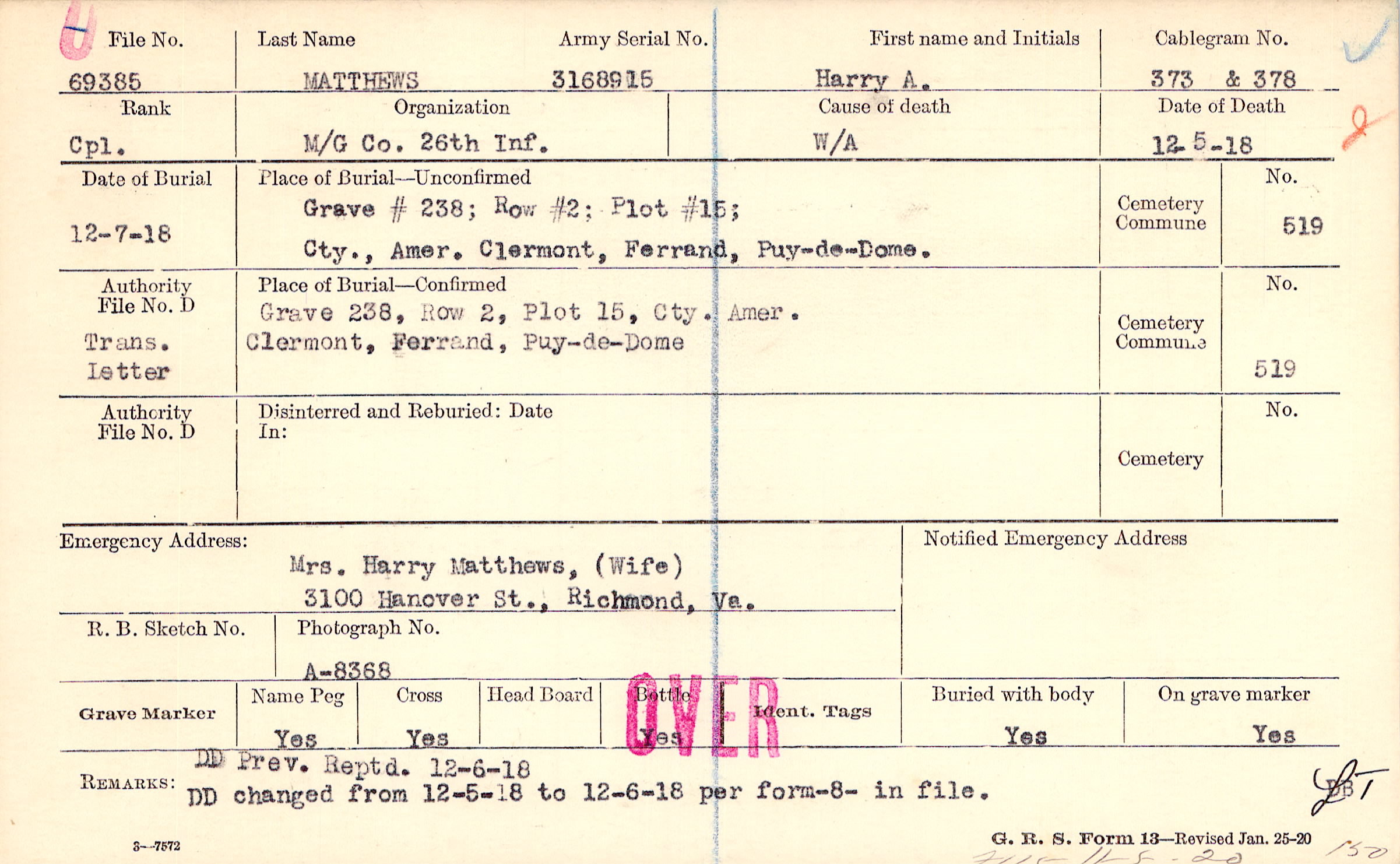 Grave # 238, Row # 2, Plot # 15, Cty.,,Amer., Clermont, Ferrand, Puy-de-Dome.