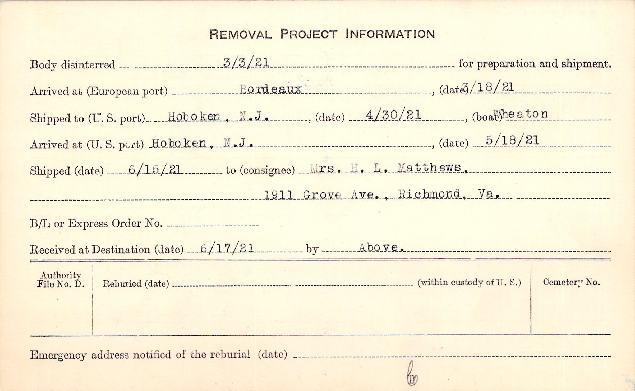 Body disinterred 3/3/1921 for preparation and shipment.
