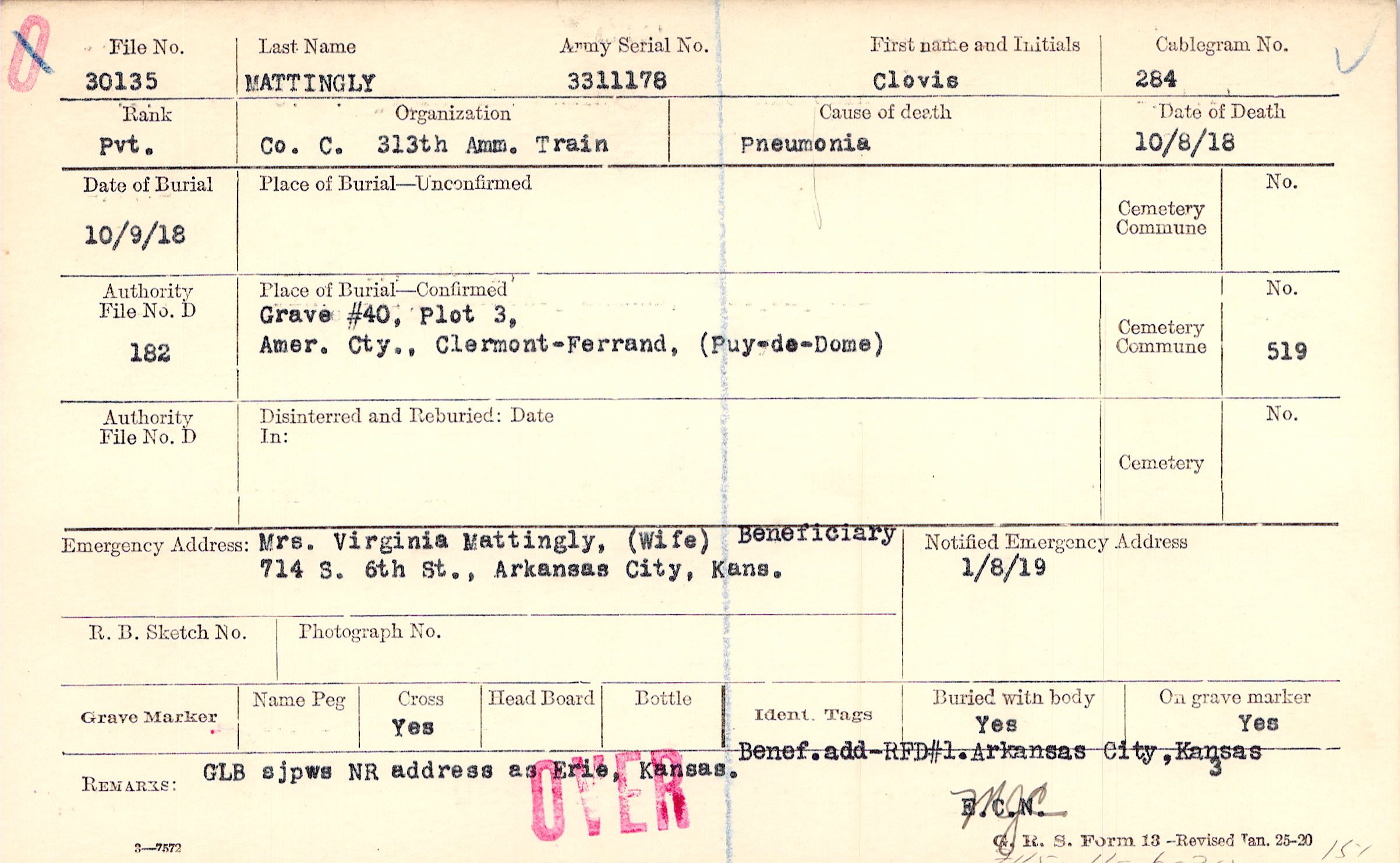 Mrs. Virginia Mattingly, (Wife), 714 S. 6th St., Arkansas City, Kans., Beneficiary