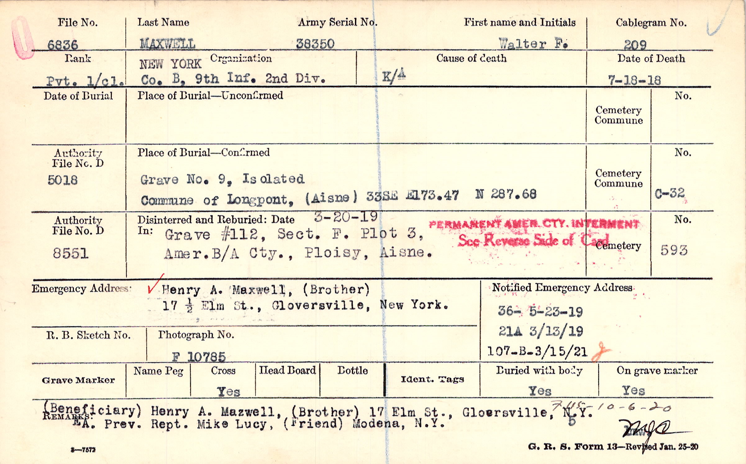 (Beneficiary) Henry A. Mazwell, (Brother) 17 Elm St., Gloersville, N.Y. EA. Prev. Rept. Mike Lucy, (Friend) Modena, N.Y., F115 - 1--6-20