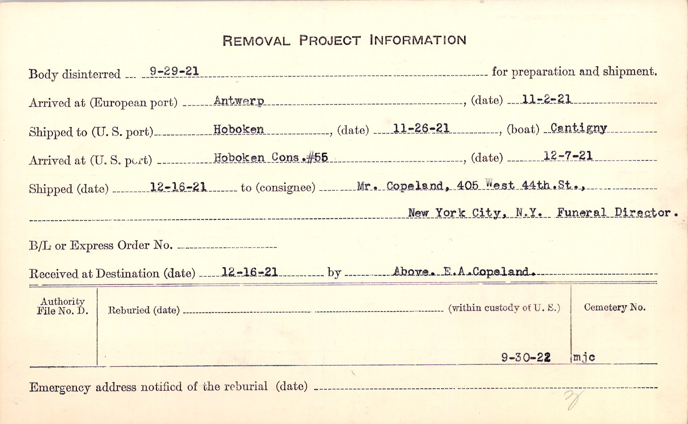 to Mr. Copeland, 405 West 44th St., New York City, N. Y., Funeral Director.