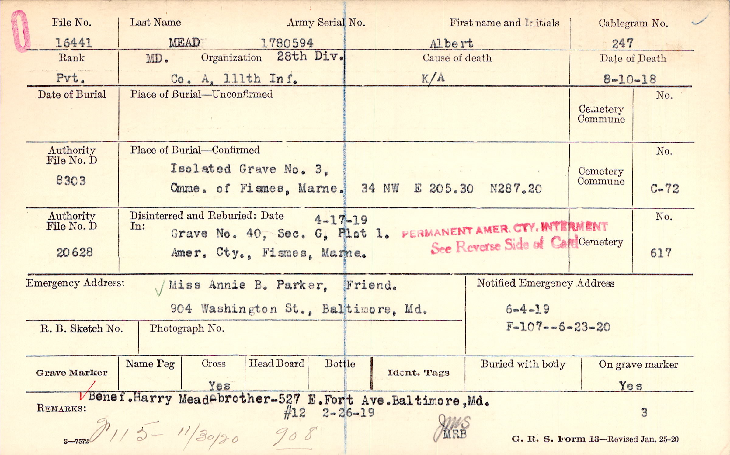 Benef. Harry Mead - brother - 527 E. Fort Ave., Baltimore, Md., F115 11/30/20 908