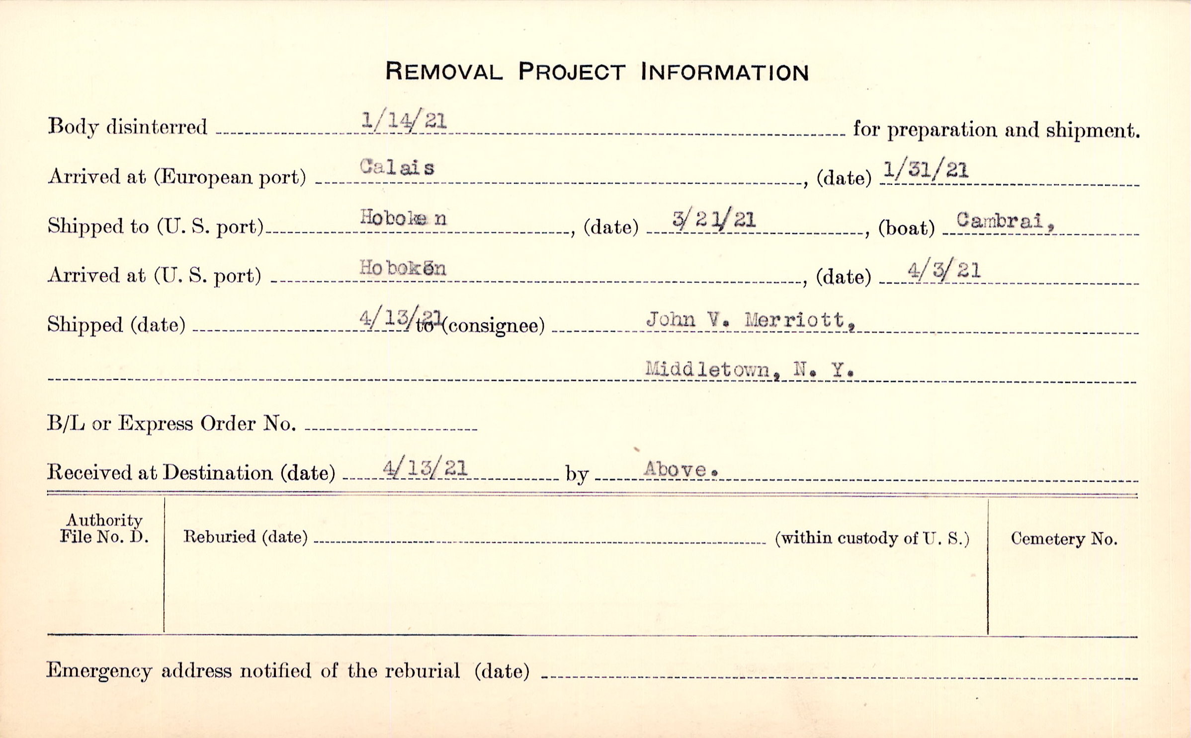 Body disinterred 1/14/1921 for preparation and shipment.