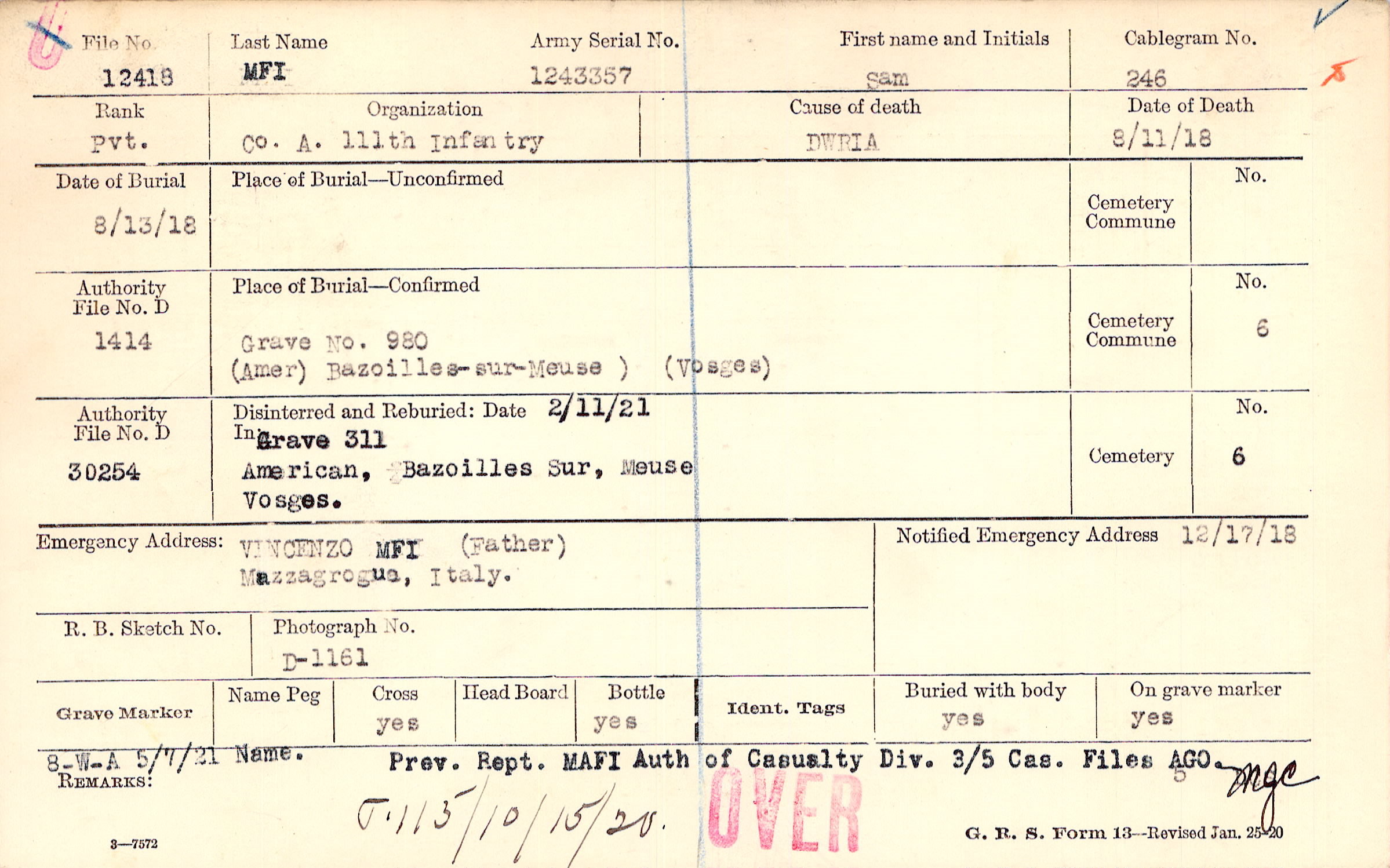Grave 311, American Cemetery, Bazoilles, Vosges