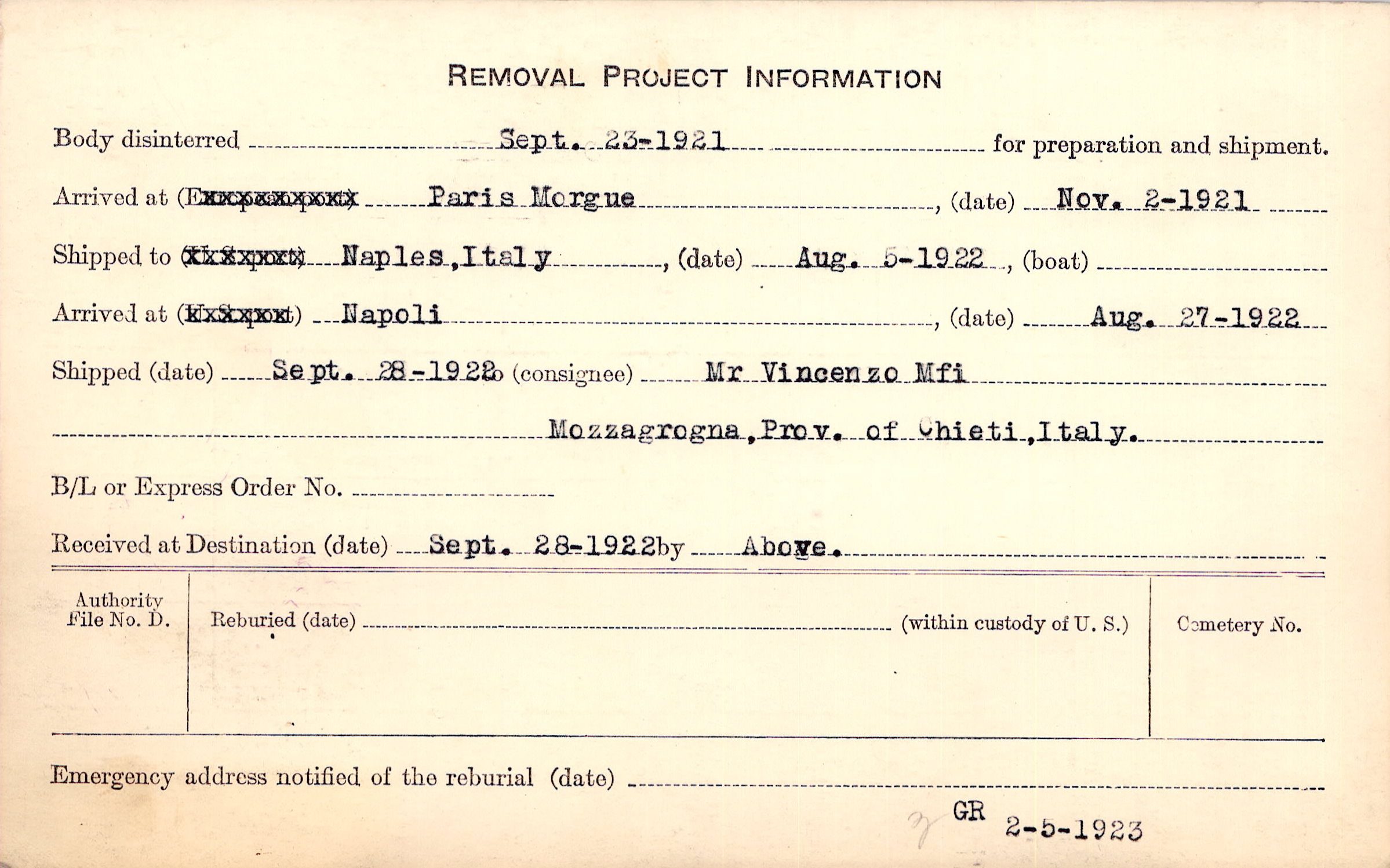 Body disinterred 9/23/1921 for preparation and shipment.