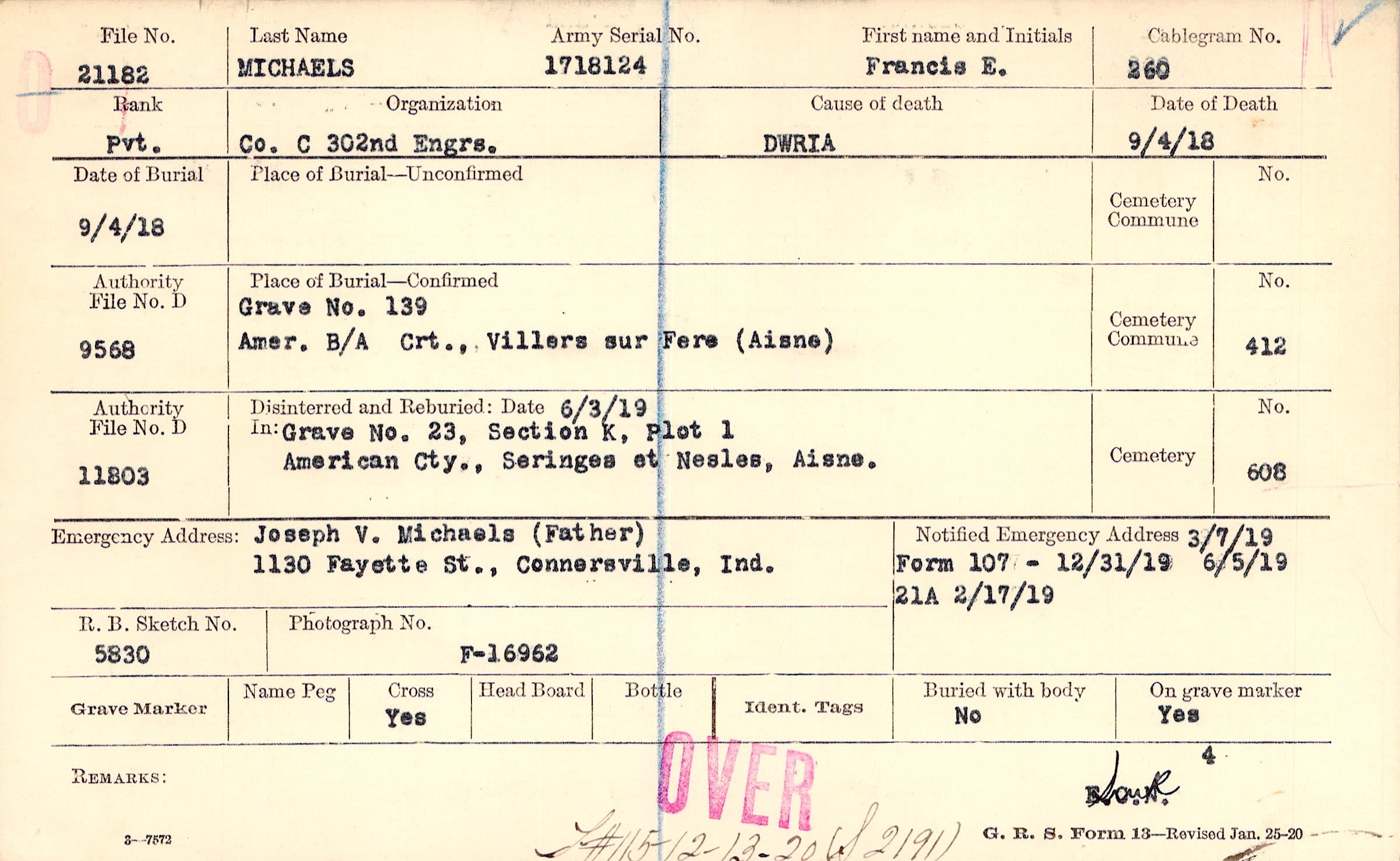 Joseph V. Michaels (Father), 1130 Fayette St., Connersville, Ind.